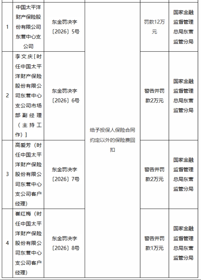 其中,太保财险东营中心支公司因给予投保人保险合同约定以外的保险费回扣被罚款12万元。李文庆,时任中国太平洋财产保险股份有限公司东营中心支公司市场部副经理(主持工作),被警告并罚款2万元;高爱芳,时任中国太平洋财产保险股份有限公司东营中心支公司客户经理,被警告并罚款2万元;崔红梅,时任中国太平洋财产保险股份有限公司东营中心支公司客户经理,被警告并罚款1万元。