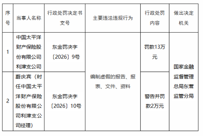 中国太平洋财产保险股份有限公司利津支公司因编制虚假的报告、报表、文件、资料被罚款13万元。同时,蔚庆宾,时任中国太平洋财产保险股份有限公司利津支公司经理,被警告并罚款2万元。