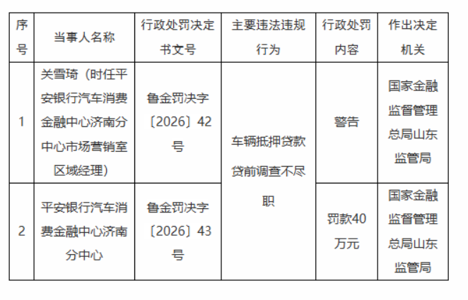 平安银行汽车消费金融中心济南分中心被罚40万元,因车辆抵押贷款贷前调查不尽职