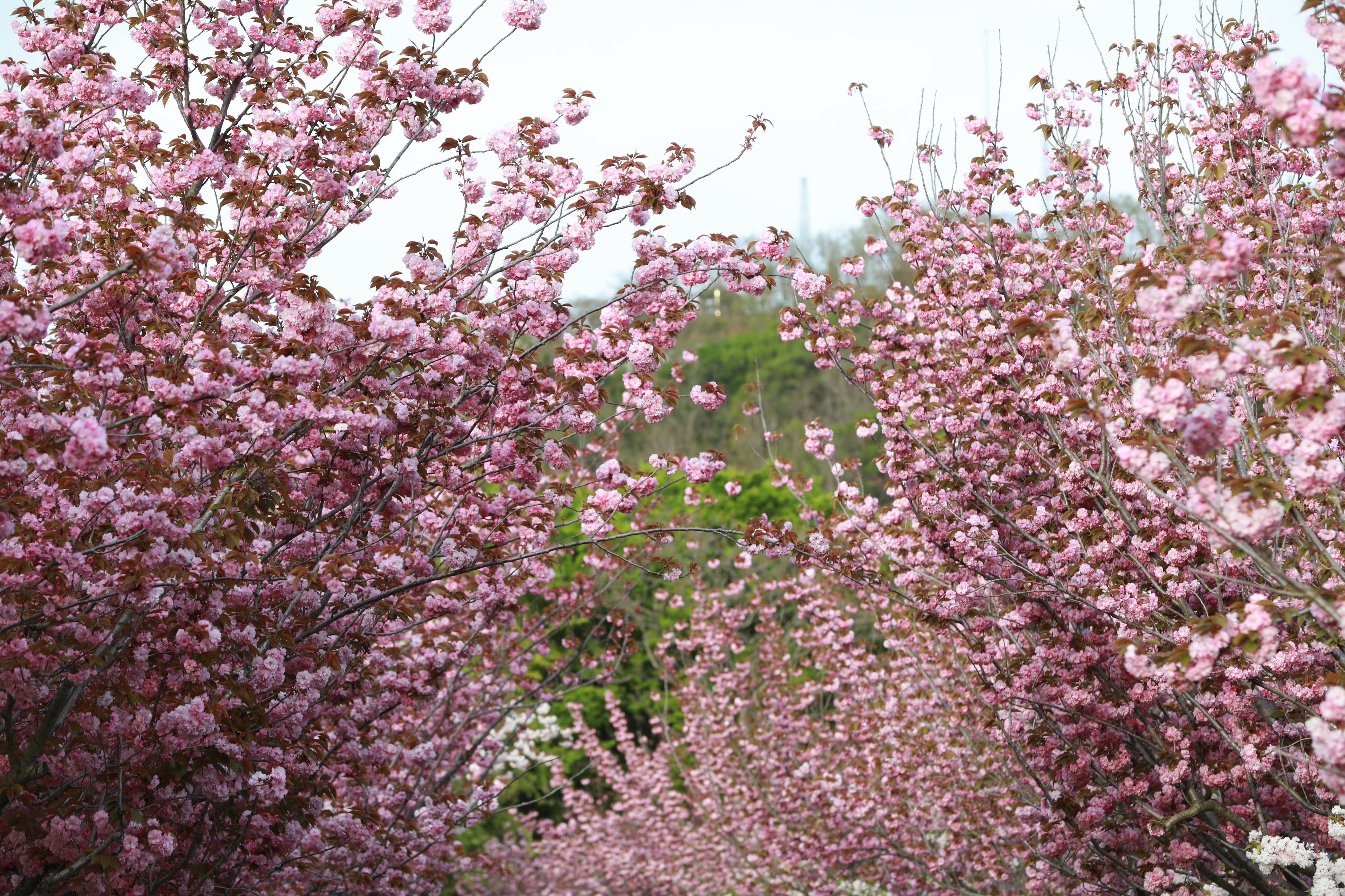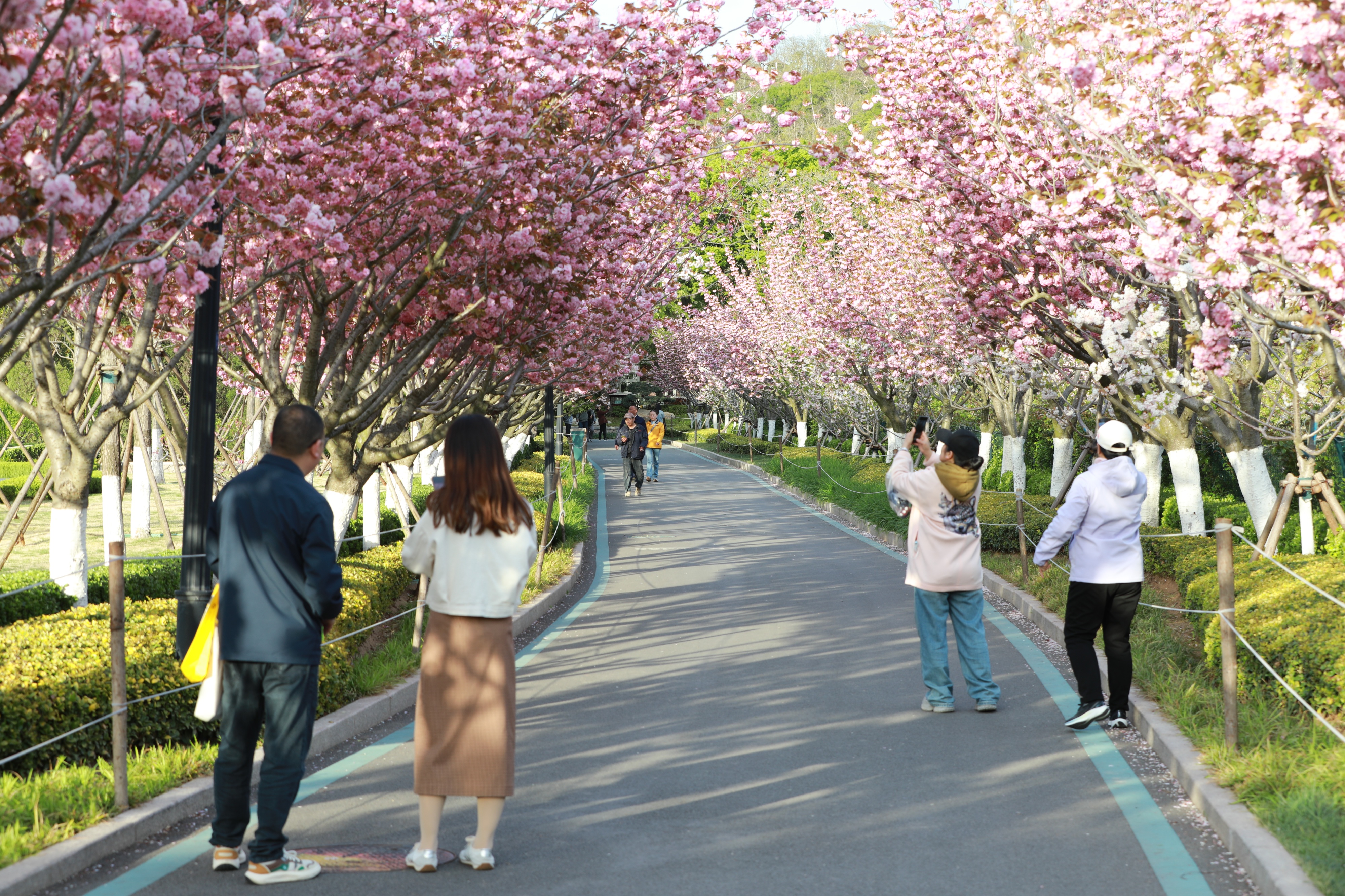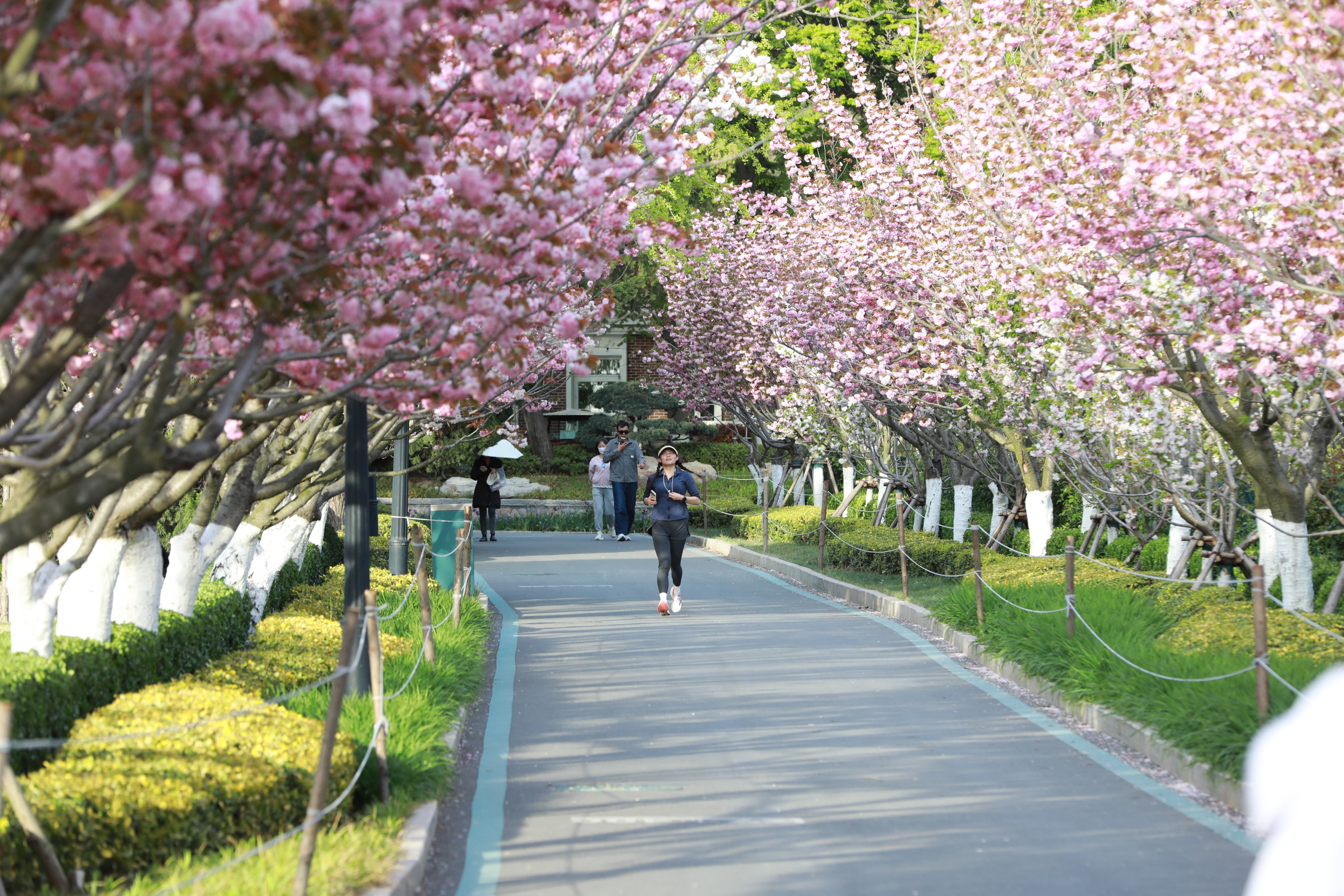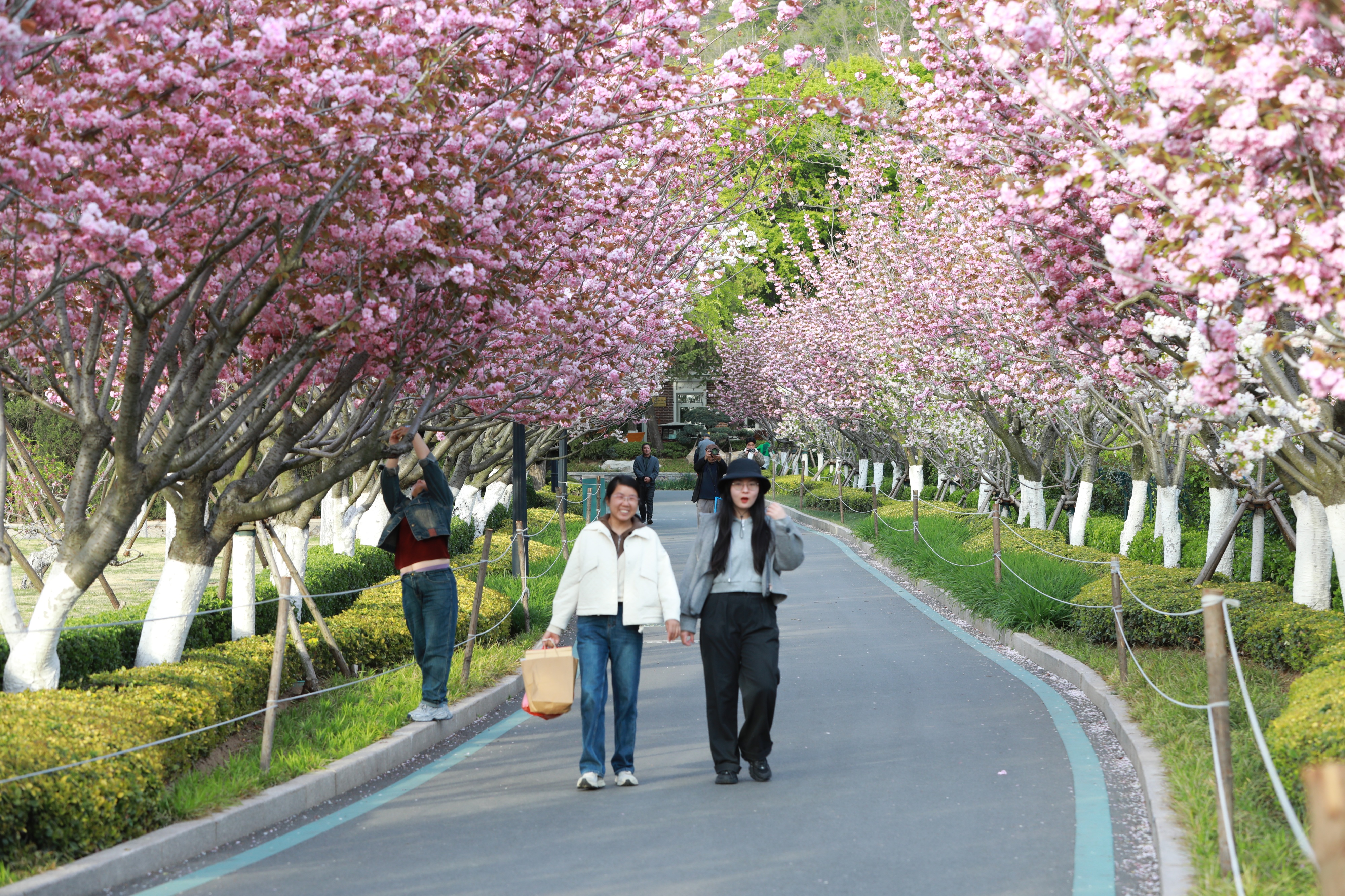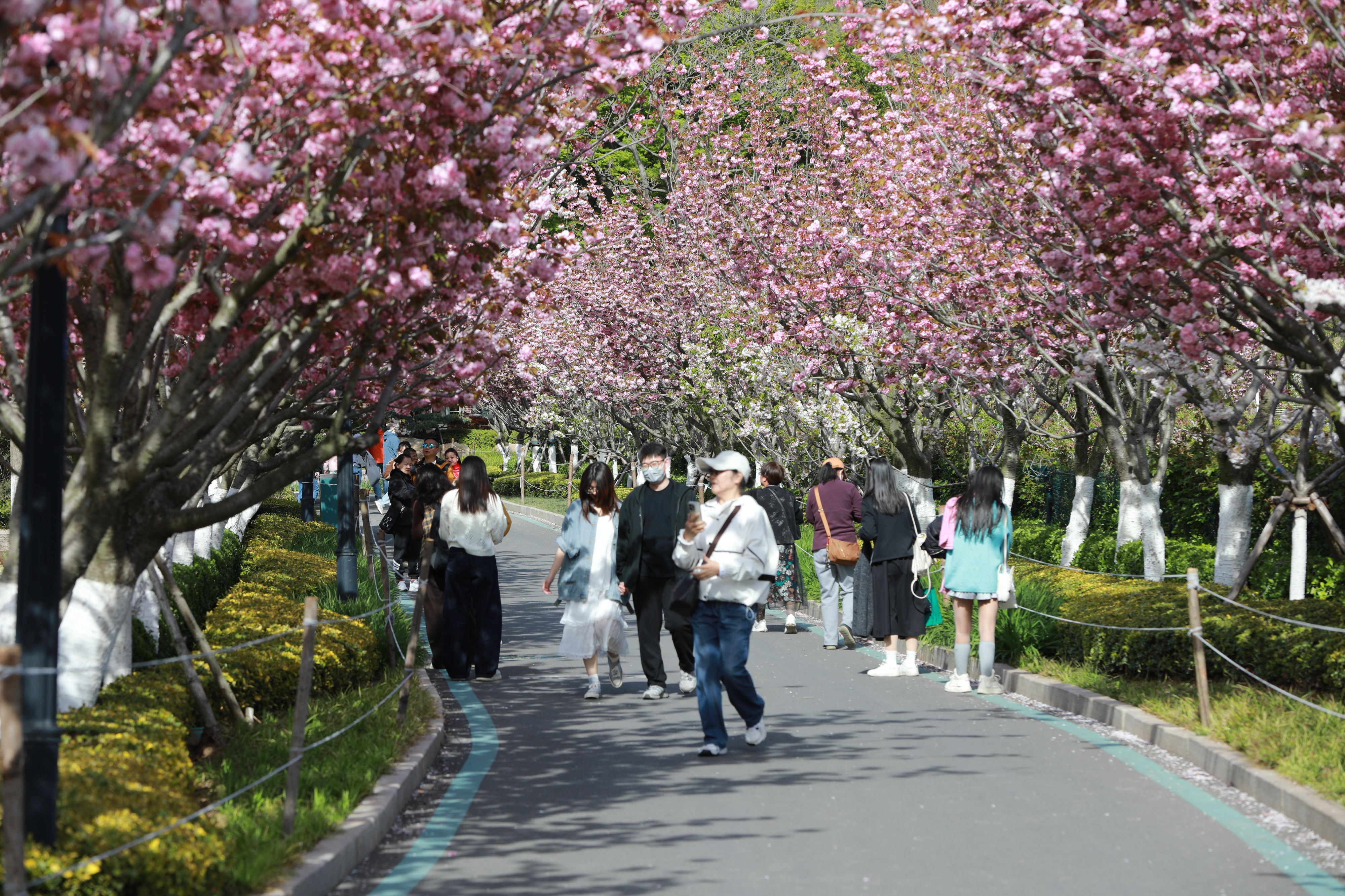 青岛中山公园双樱盛放,粉艳花海引市民游客争相打卡