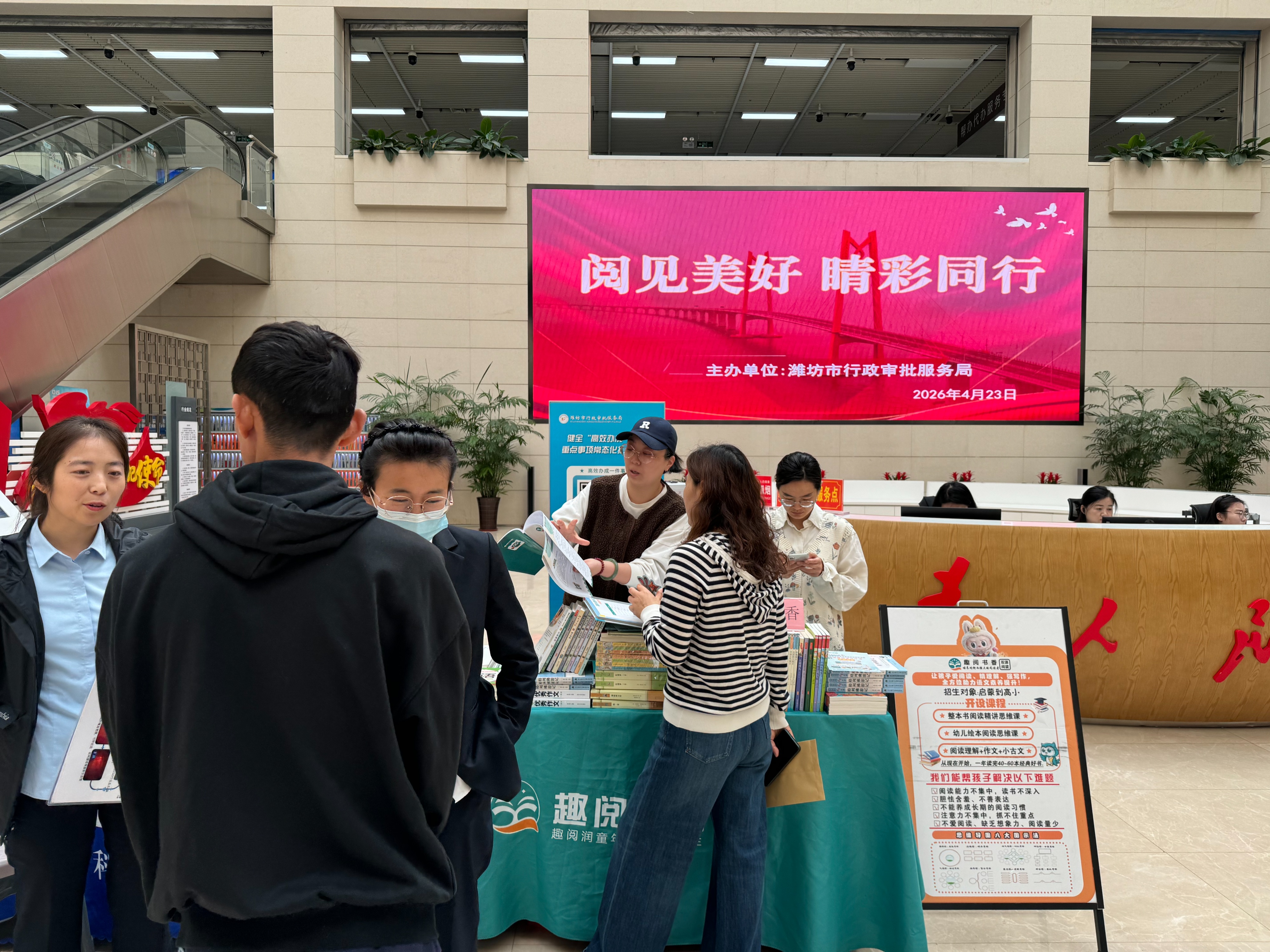 4月23日,潍坊市政务服务大厅一楼中厅书香氤氲、暖意融融,潍坊市审批服务局组织的“我为企业组主场”读书护眼主题活动举行。活动以“世界读书日”为契机,创新“政务搭台、企业唱戏、群众受益”模式,邀请眼科医院、优质图书社、眼镜企业等多家优质单位入驻,为办事群众带来一场兼具书香与健康的公益服务。
