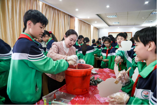 在非遗体验区,专业老师现场演示拓片技艺,指导学生们亲手制作专属拓片作品,感受纸墨留痕的历史温度;同时,老师还介绍了漆艺基础知识,同学们以“漂漆”技法将颜料滴入水面,利用水的张力形成自然纹理后浸入扇面,制作出独一无二的漆扇。两个体验环节将传统工艺与动手实践相结合,深受学生欢迎。