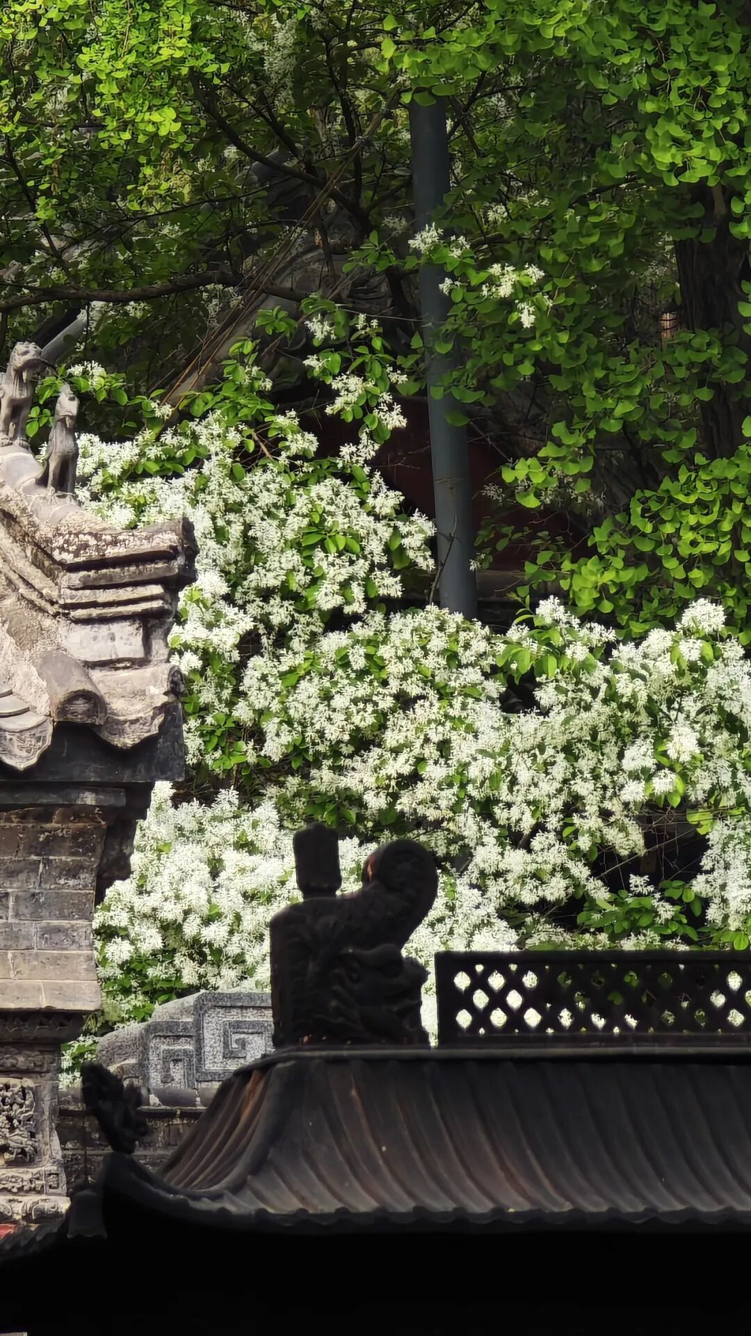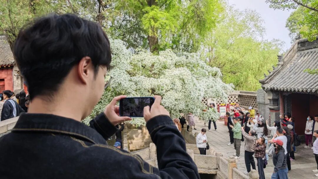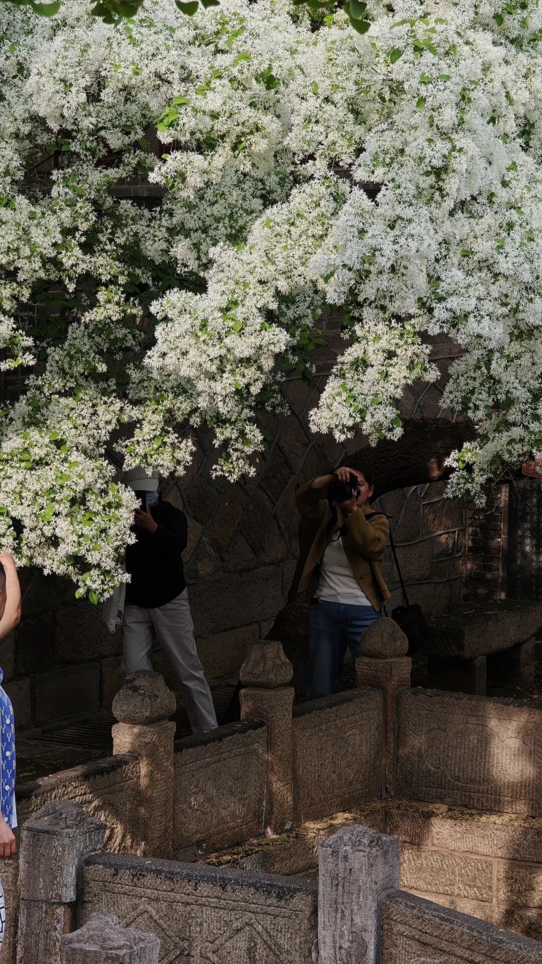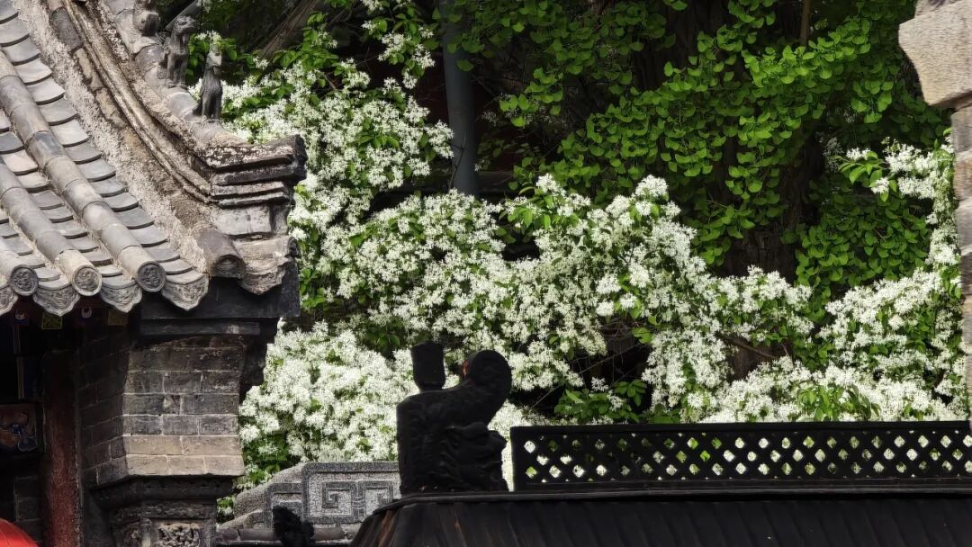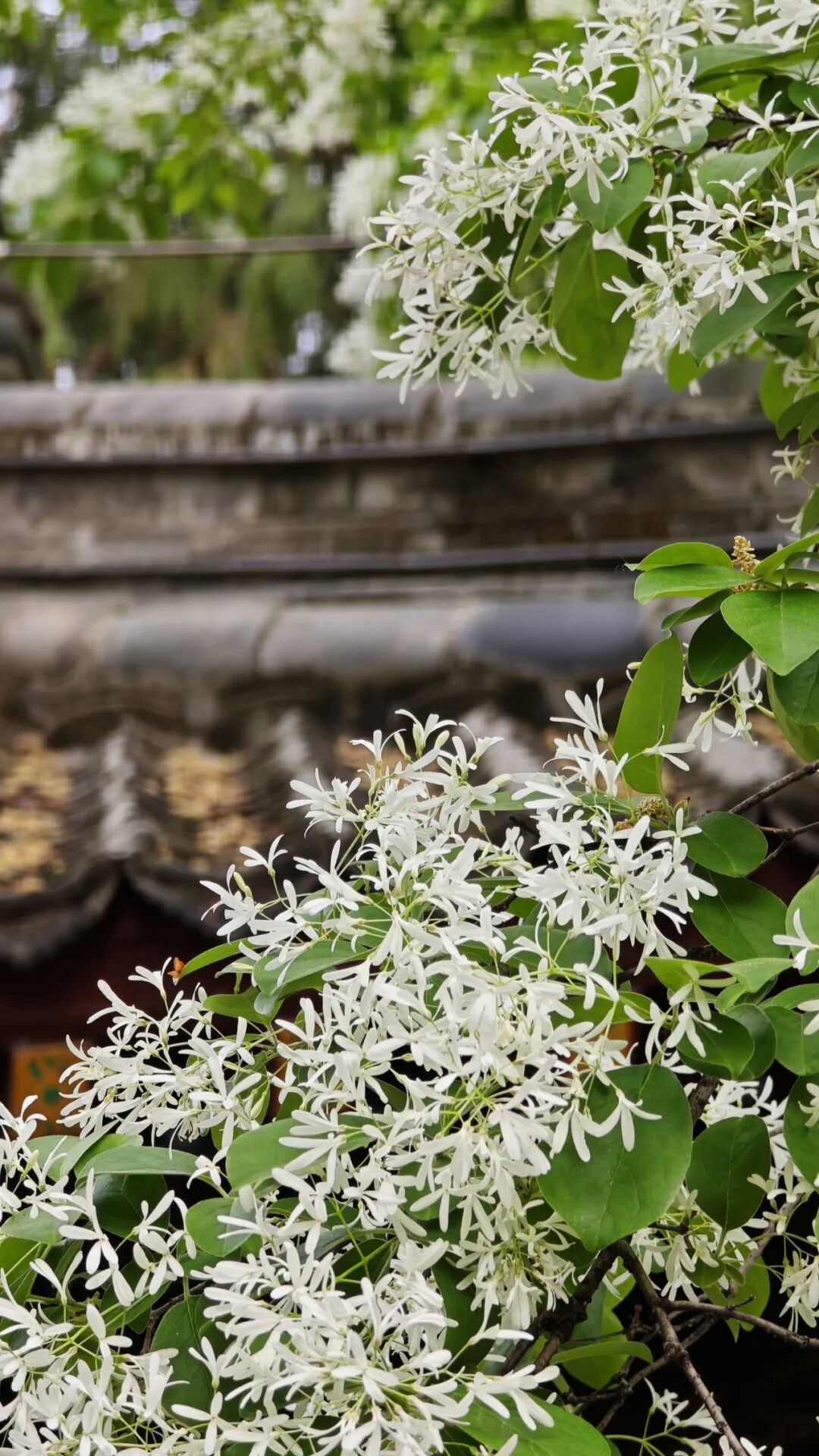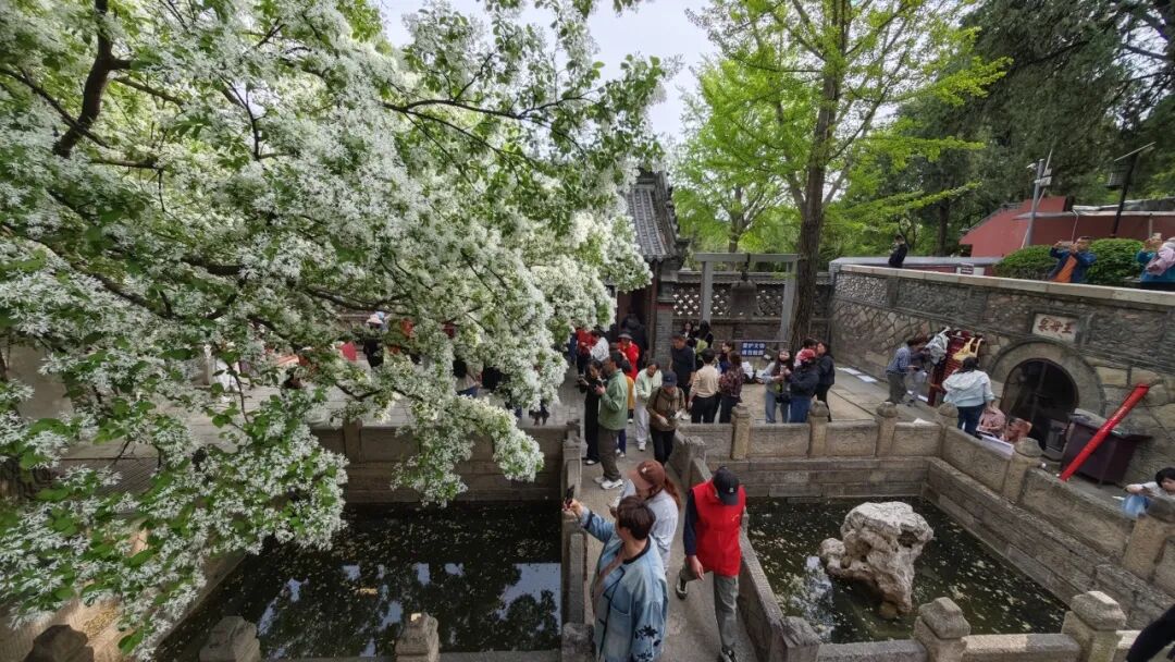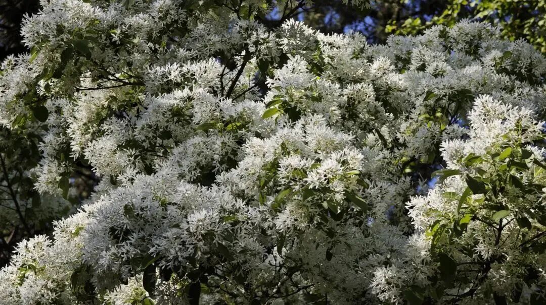 近日,这里的流苏花已悄悄缀枝、次第绽放,如今正值盛花期,满树素蕊凝霜缀雪,美得恰到好处。