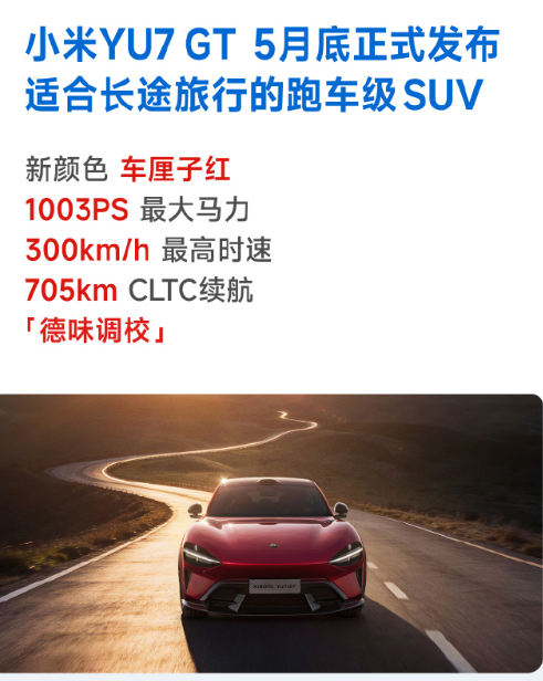 同日9点,小米汽车官方微博发文:小米YU7GT,5月底正式发布,是一台原汁原味的纯血GT,是一台充满驾驶乐趣,也能长途驾驶的跑车级SUV。