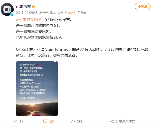 4月24日,2026北京车展开幕,在小米汽车发布会上,小米集团董事长、CEO雷军发表演讲,正式宣布:小米YU7GT将于5月底发布,定位是适合长途旅行的高性能SUV。