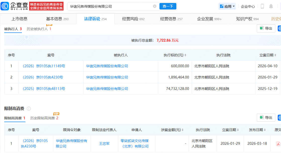 企查查显示,华谊兄弟传媒股份有限公司成立于2004年11月,注册资本约27.7亿元,由王忠军、王忠磊等共同持股。风险信息显示,华谊兄弟已被列为被执行人,并被限制高消费。