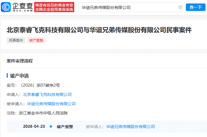 企查查APP显示,近日,华谊兄弟新增一则破产审查案件信息,申请人为北京泰睿飞克科技有限公司,经办法院为浙江省金华市中级人民法院。