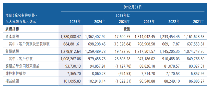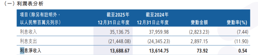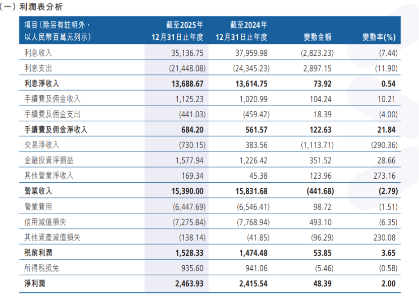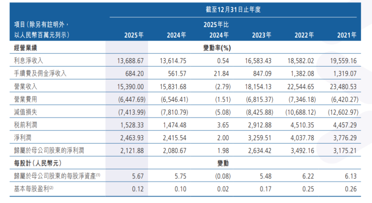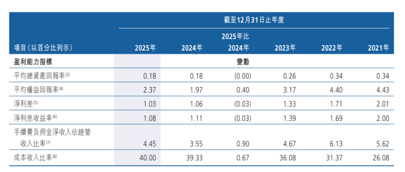 面对盈利承压局面,该行持续推进降本增效与结构优化。据年报显示,截至2025年末,该行员工总数为12995人,较上年末减少404人,已连续四年实施人员精简。与此同时,盈利结构单一问题更为突出,2025年该行实现利息净收入136.89亿元,营业收入153.90亿元,利息净收入占营收比重达88.95%,对传统息差业务高度依赖;年末净息差(净利息收益率)降至1.08%,较往年累计回落明显,显著低于行业平均水平;非息收入增长乏力,手续费及佣金净收入规模较小,交易净收益更由盈转亏。
