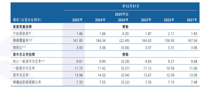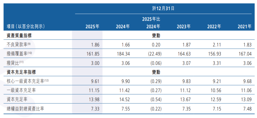 但潜在风险仍在积聚,该行年末关注类贷款占比6.49%,规模达458.18亿元,逾期贷款较年初增190.2亿元,向下迁徙压力显著。其资本水平同步承压,核心一级资本充足率9.61%、资本充足率13.98%,均同比下降,资本净额减少68亿元,内生增长能力不足。