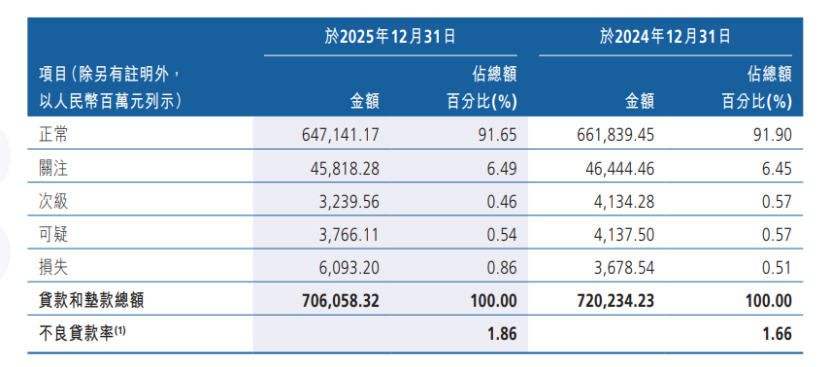 该行资产质量呈现显著结构性分化,对公业务风险持续收敛,个人贷款成为最大风险敞口。截至2025年末,广州农商行不良贷款率1.86%,同比上升0.2个百分点,高于行业平均水平。