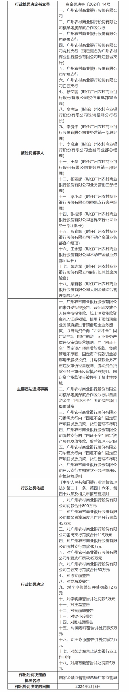记者梳理监管部门公开信息发现,2024年,该行曾因未办妥抵押登记即发放个人住房按揭贷款、消费贷资金违规流入证券等禁止性领域、信用卡额度管理失控等多项严重违规,被广东监管局合并处罚1105万元,其中总行被罚800万元。