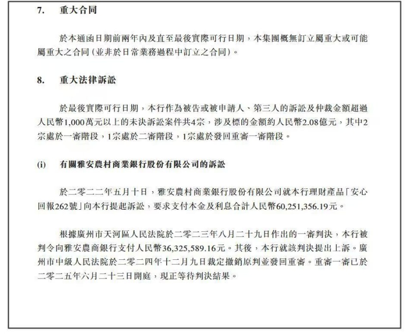 在内控合规问题凸显的同时,该行重大诉讼风险仍在延续。根据广州农商行2025年11月6日发布的公告,截至公告日,该行作为被告或被上诉人的千万元以上未决诉讼共计4起,涉案总额2.08亿元。记者注意到,相关案件均处于审理进程中,尚未形成终审结果,不仅可能形成直接资金损失,更对该行同业信誉与品牌形象造成持续影响。