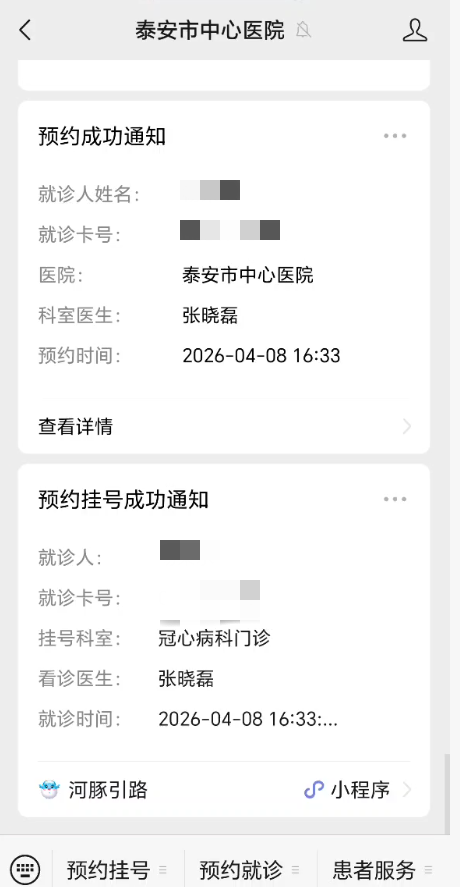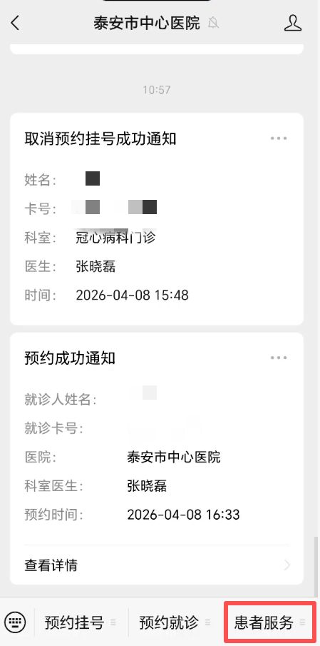 1、首先,要确保您已成功在“泰安市中心医院”微信服务号预约挂号。
