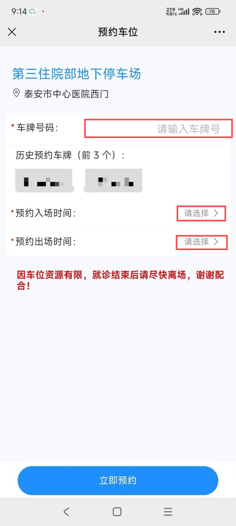 5、登陆后,输入车辆的车牌号以及车辆的入场时间、出场时间,核对无误后点击“立即预约”。
