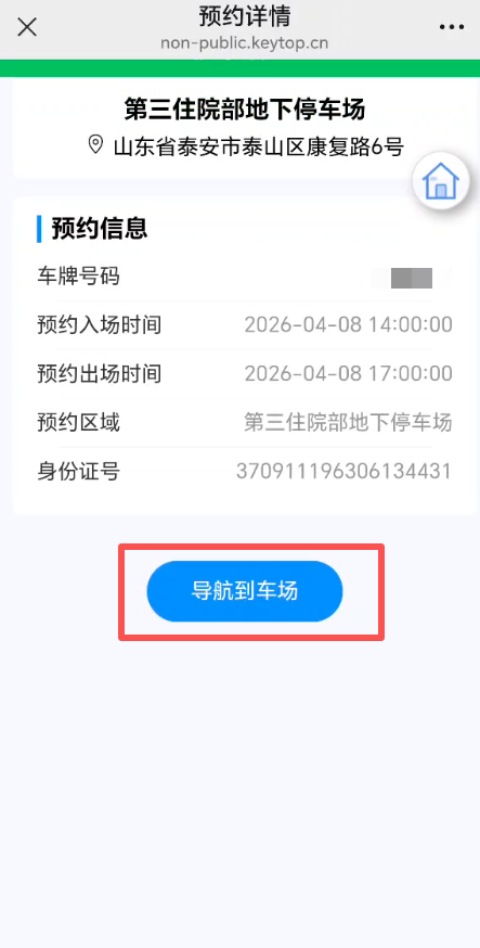 6、预约完成后,可以导航至康复路中心医院西门,通过车牌自动识别系统进入院区,进入后,沿着通道向前,经过第三住院部通道后,左转进入地下停车场,按地上标记,找到相应车位,停车后,步行原路返回至医院地面,按指示路线就医即可。