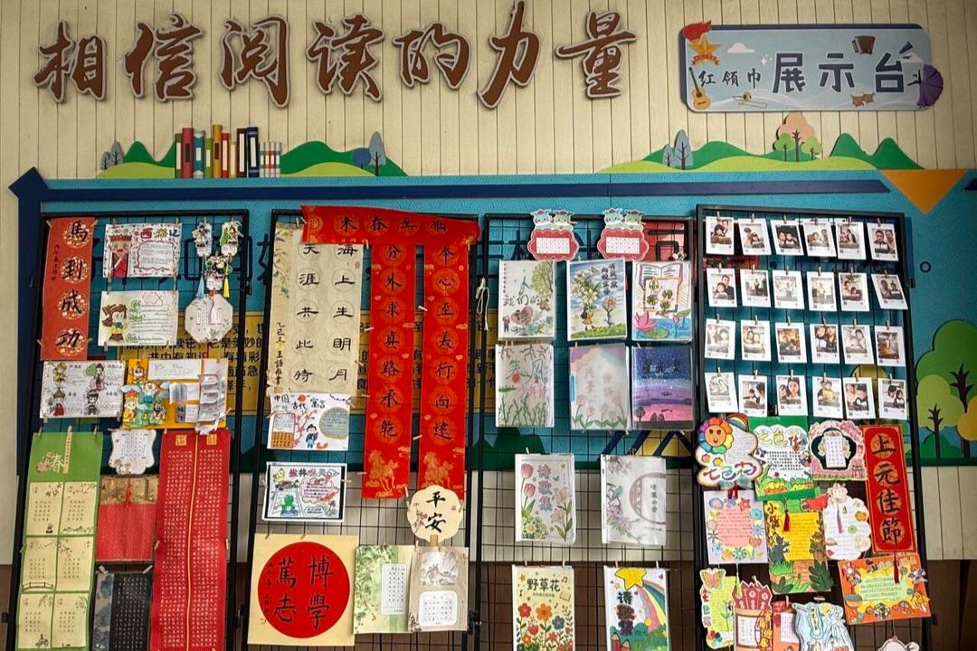 一进校门,便被浓浓的书香包围。校园里的展示架上,整齐陈列着孩子们的书法作品、读书小报、故事人物卡和精品读后感。这是“阅见成长”阅读成果展的现场。