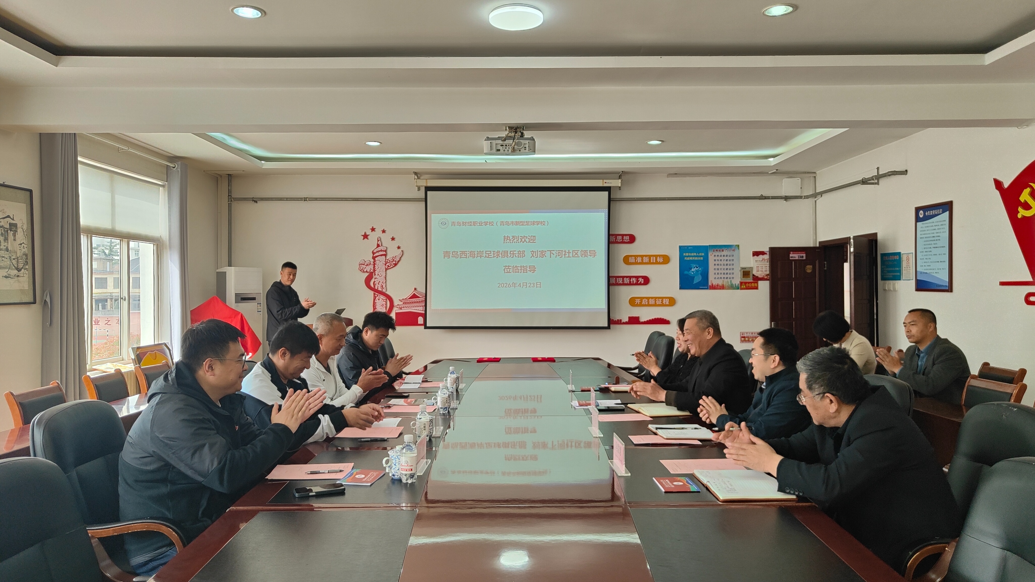 此次签约仪式旨在深化体教融合,搭建足球人才培养桥梁,实现学校与职业俱乐部资源互补、协同发展,为青少年足球成长赋能,助力青岛足球重点城市建设。签约仪式伊始,全体人员共同观看了青岛财经职业学校(青岛市新型足球学校)宣传片,全方位感受学校四十余载深耕足球育人的初心使命、发展历程与丰硕成果。