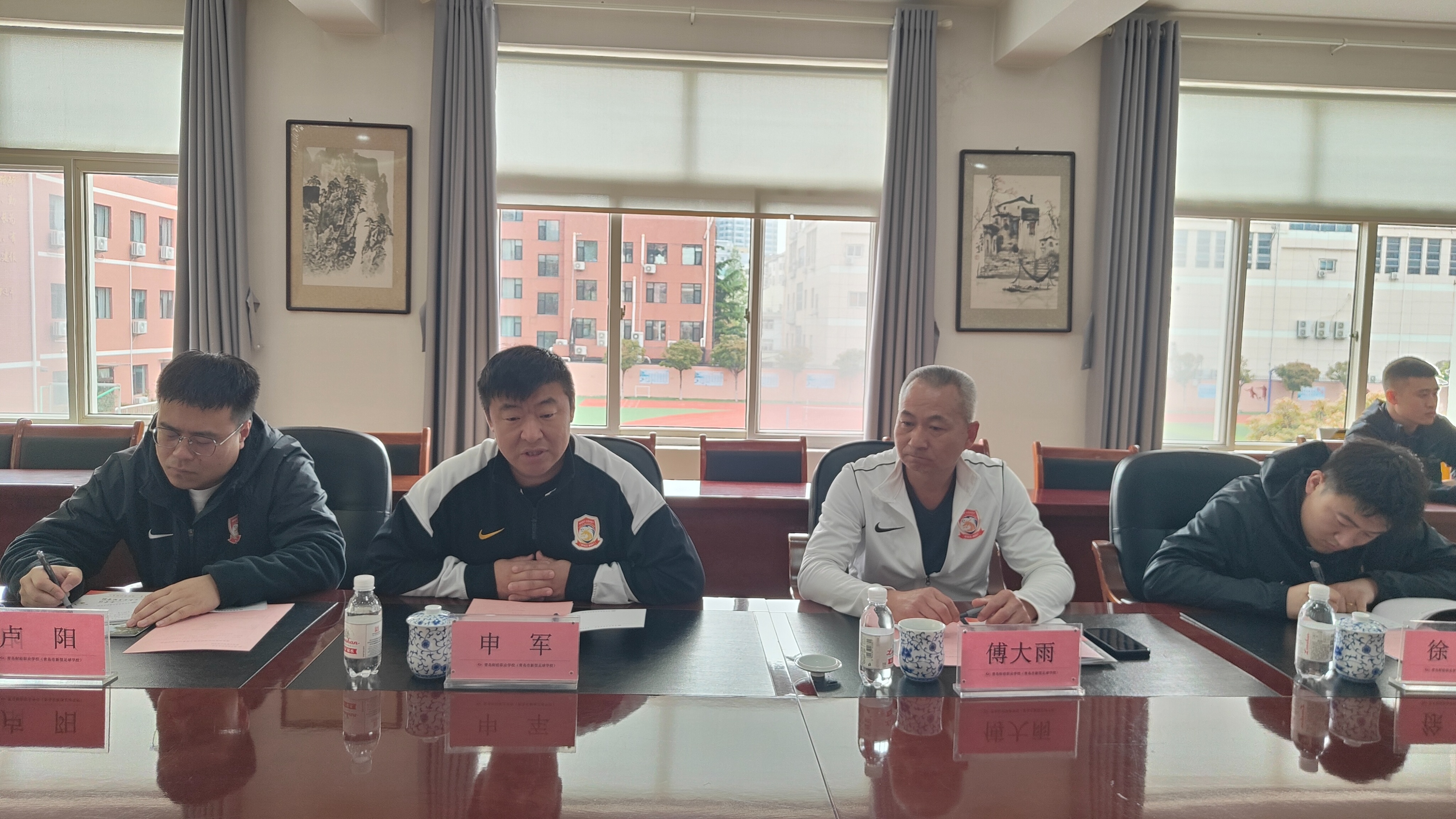 随后,刘杰副校长与申军总经理共同签署合作协议,双方交换签约文本、握手合影,定格这一历史性时刻。在热烈的掌声中,刘杰副校长与申军总经理共同为双方合作基地揭牌,标志着青岛市新型足球学校与青岛西海岸足球俱乐部的合作正式落地生根。仪式最后,双方领导围绕人才培养、训练合作、赛事共建等核心议题开展深入座谈,进一步明确了合作方向与具体举措。