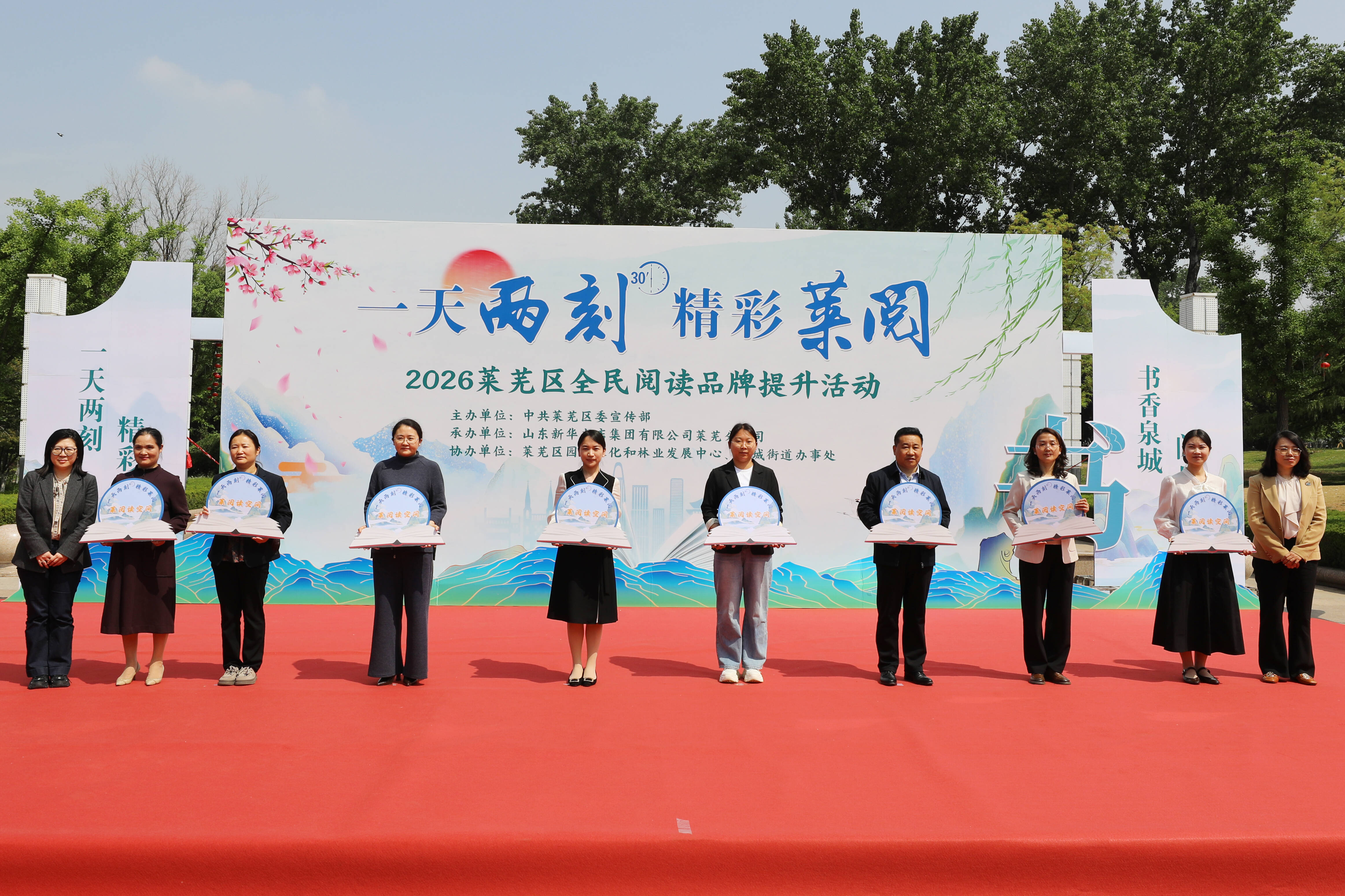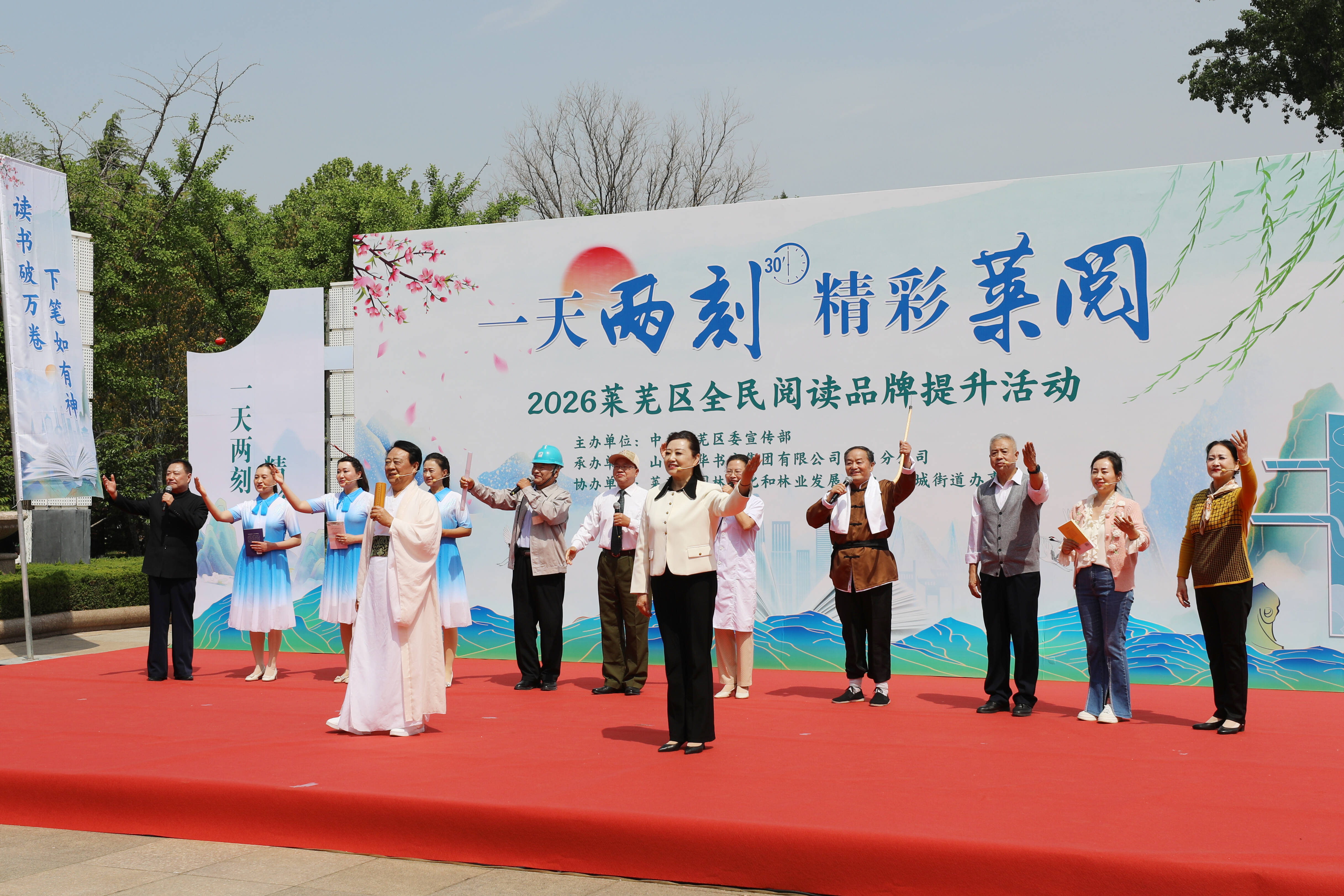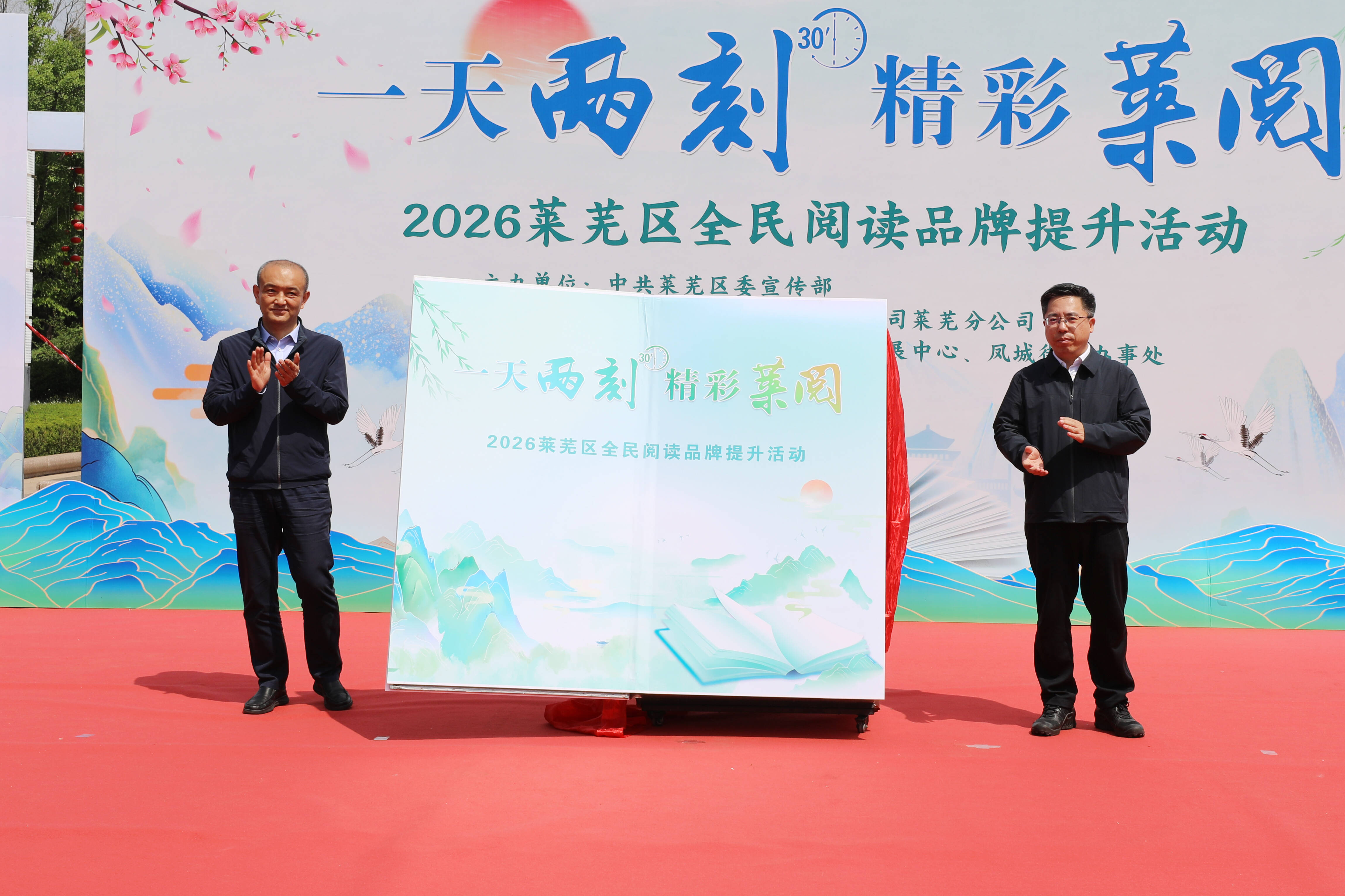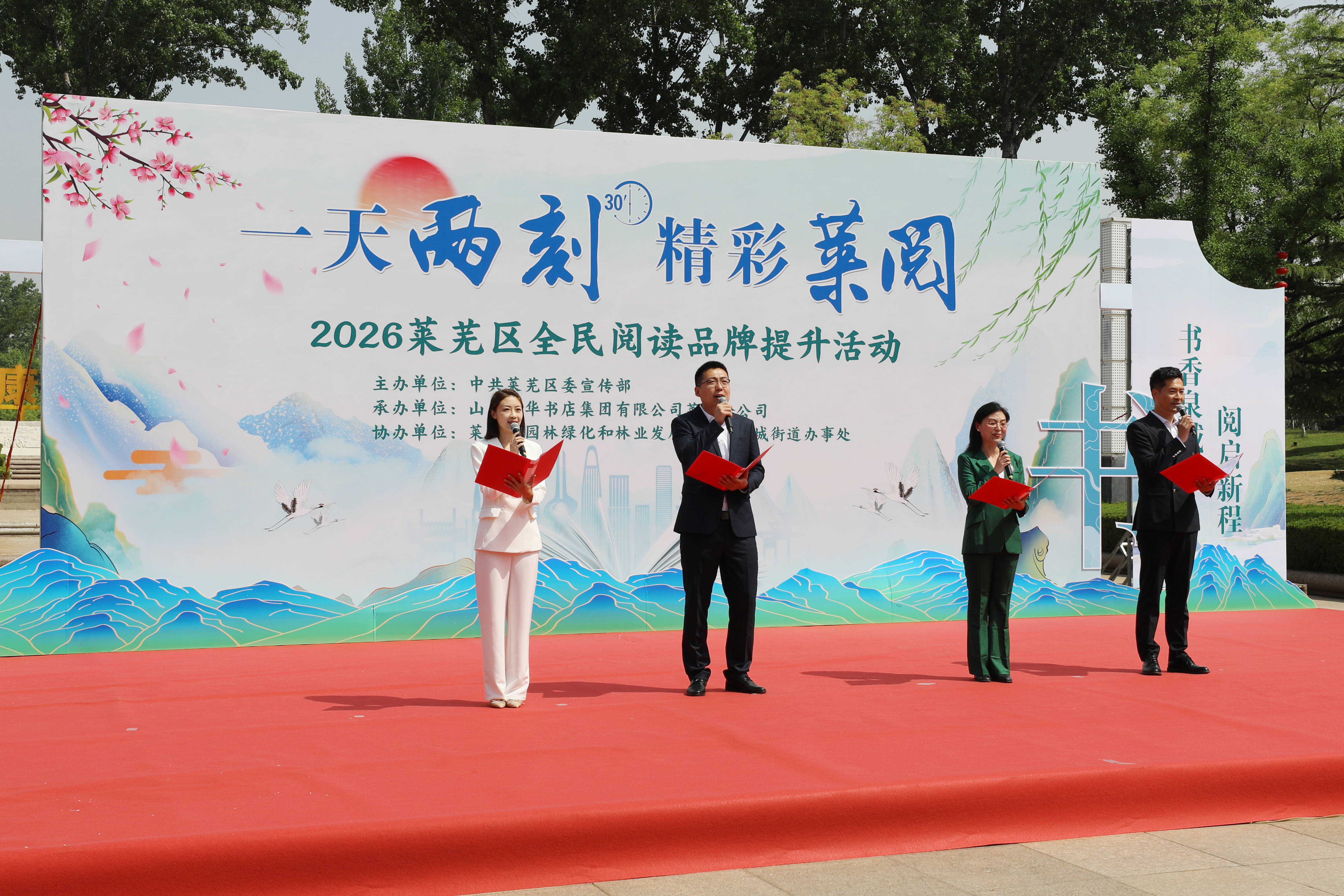 4月23日上午,世界读书日当天,济南市莱芜区红石公园内书香四溢。“一天两刻 精彩莱阅”2026莱芜区全民阅读品牌提升活动在这里正式启幕。中国新闻出版传媒集团党委委员、副总经理武远明,莱芜区委常委、宣传部部长田冲等共同为活动按下“启动键”。