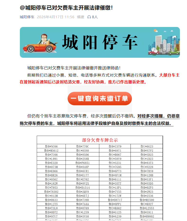 据城阳停车发布的行管信息显示,此前已通过停车小票、短信、电话等多种方式,对欠费车主进行沟通提醒和催缴,大部分车主在接到通知后已及时结清欠费,相关起诉也已撤诉处理。但仍有个别车主心存侥幸,恶意拖欠停车费,经多次提醒后仍拒不缴纳,对此,城阳停车将依法运用法律手段维权,切实保障自身及按时缴费车主的合法权益,呼吁广大欠费车主及时核实自身欠费情况,主动补缴,避免因小额欠费留下信用污点,切莫因小失大。