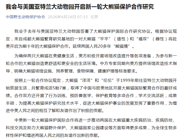 中新网4月24日电 据“中国野生动物保护协会”微信公众号消息,中国野生动物保护协会于去年与美国亚特兰大动物园签署了大熊猫保护国际合作研究协议。根据协议规定,来自成都大熊猫繁育研究基地的一对大熊猫“平平”(雄性)和“福双”(雌性)将赴美开启为期十年的大熊猫保护合作。延续两国人民20多年“熊猫情”。