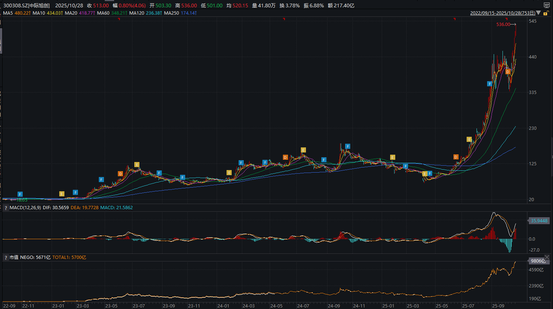 4月23日早盘,中际旭创股价强势拉升,盘中最高触及919.99元/股,总市值一度达1.01万亿元,成功跻身A股万亿市值俱乐部。截至收盘,股价报897元/股,上涨1.17%,总市值9989亿元,稳居创业板第二大市值公司,仅次于宁德时代。