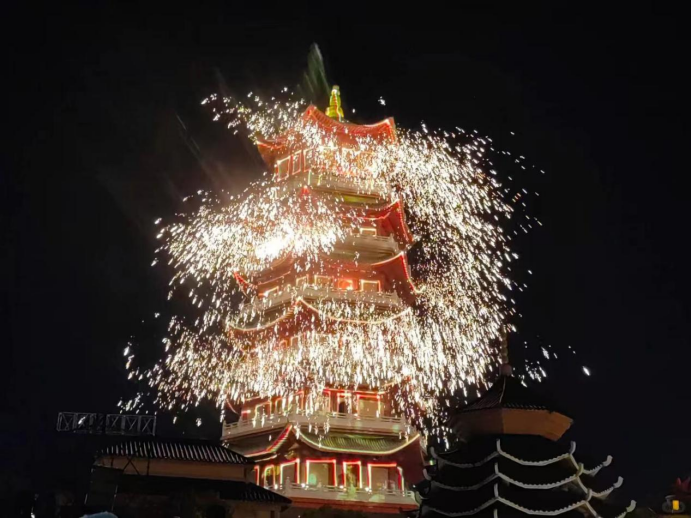 夜幕降临,万盏孔明灯同步升空,与星空交相辉映,承载着万千游客的美好心愿,营造治愈又温馨的浪漫氛围,成为游客假期专属的暖心记忆。雷峰塔“花火星河秀”震撼上演,非遗铁花绚烂绽放,搭配唯美灯光特效,古韵与现代光影交织,为游客呈现一场视觉震撼、浪漫至极的夜间盛宴。