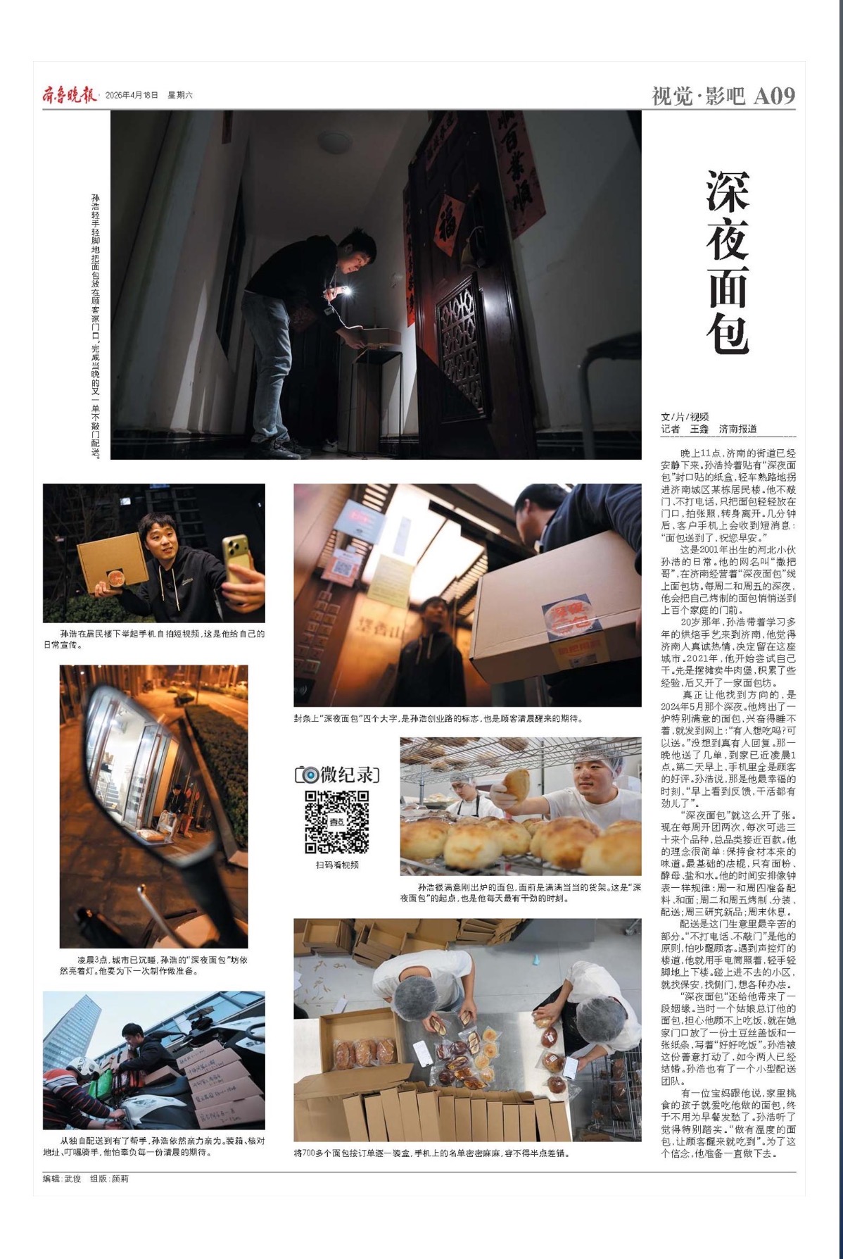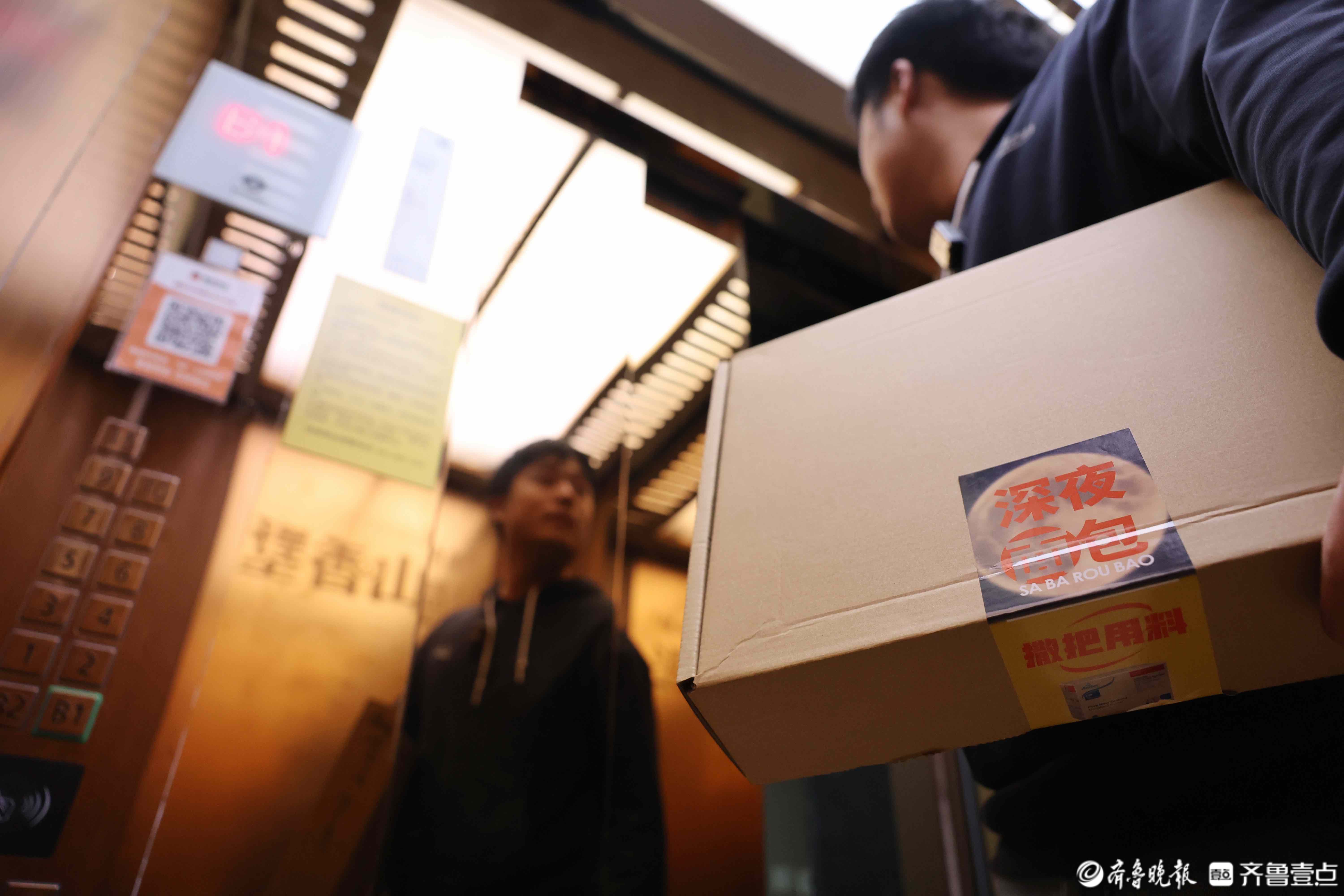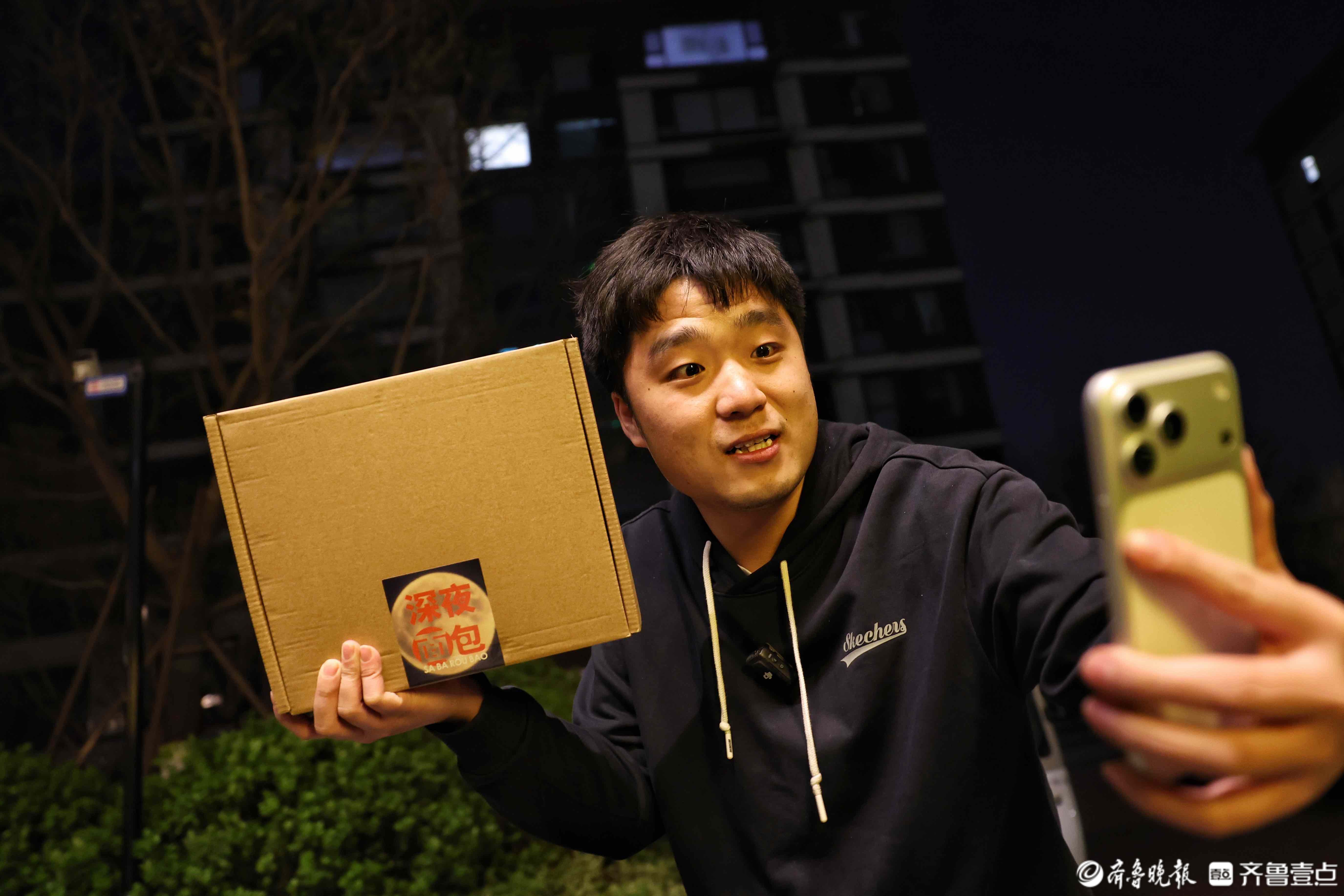 晚上11点,济南的街道已经安静下来。孙浩拎着贴有“深夜面包”封口贴的纸盒拐进一栋居民楼。他没有敲门也没有打电话,只把面包轻轻放在门口,拍张照,转身离开。几分钟后,客户手机上会收到短消息:“面包送到了,祝您早安。”
