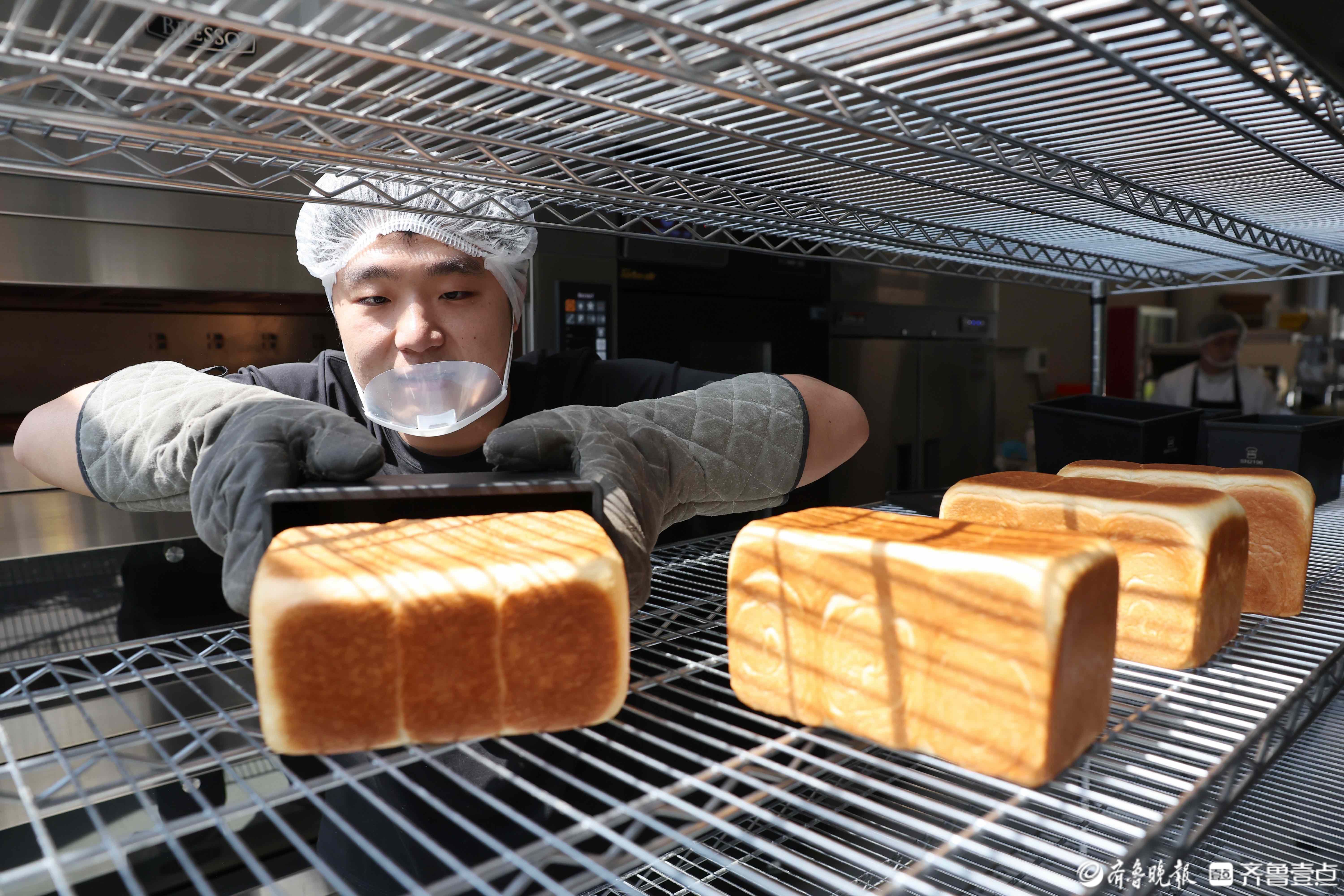 孙浩很满意刚出炉的面包,面前是满满当当的货架。这是深夜面包的起点,也是他每天最有干劲的时刻。