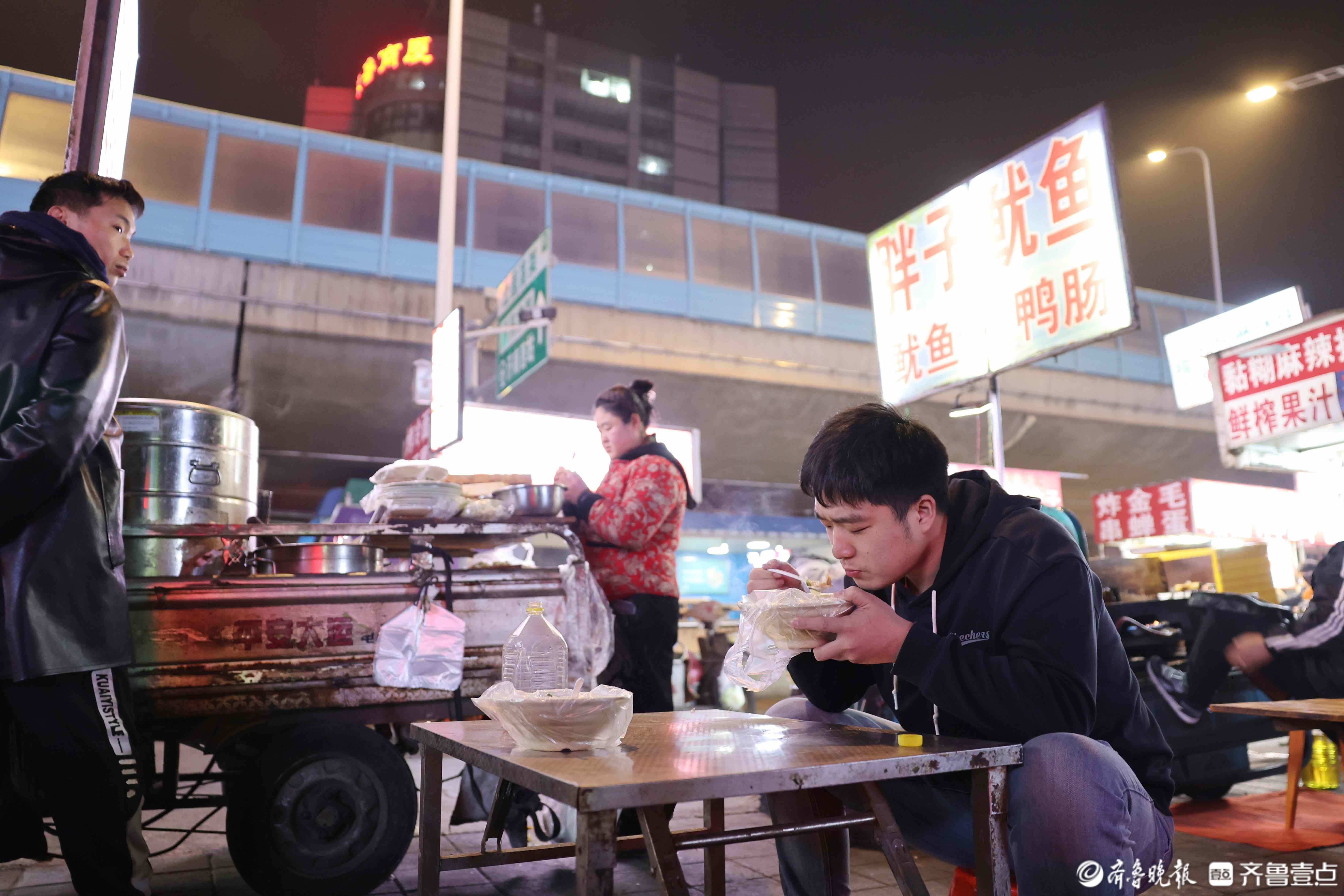 凌晨2点送完最后一单,孙浩在路边摊匆匆吃口热饭。这顿“晚饭”是他一天中最踏实的时刻。