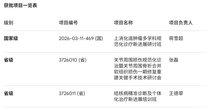 继续医学教育项目是衡量医院学术水平、科研能力及教学质量的重要指标。此次获批项目的学科涵盖了消化道肿瘤、关节骨科及结核病防治等多个重点学术领域,标志着医院在学科建设与人才培养方面迈出了坚实的一步。