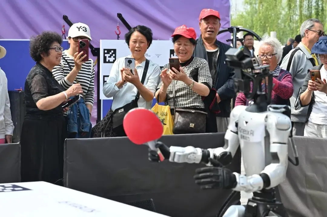一边是乒乓冠军、民间高手,一边是硅基新秀,人机对战一触即发。活动现场,人形机器人依托灵活的机械控制与智能感知能力,精准判断来球旋转与落点,在毫秒级反应中完成高速对抗回击,实现扣杀、低蹲救球等复杂动作,吸引众多乒乓爱好者下场对练。中国自主研制的室外乒乓机器人系统从“神秘黑科技”走向更多大众应用场景,为文体旅融合开启更多想象空间。