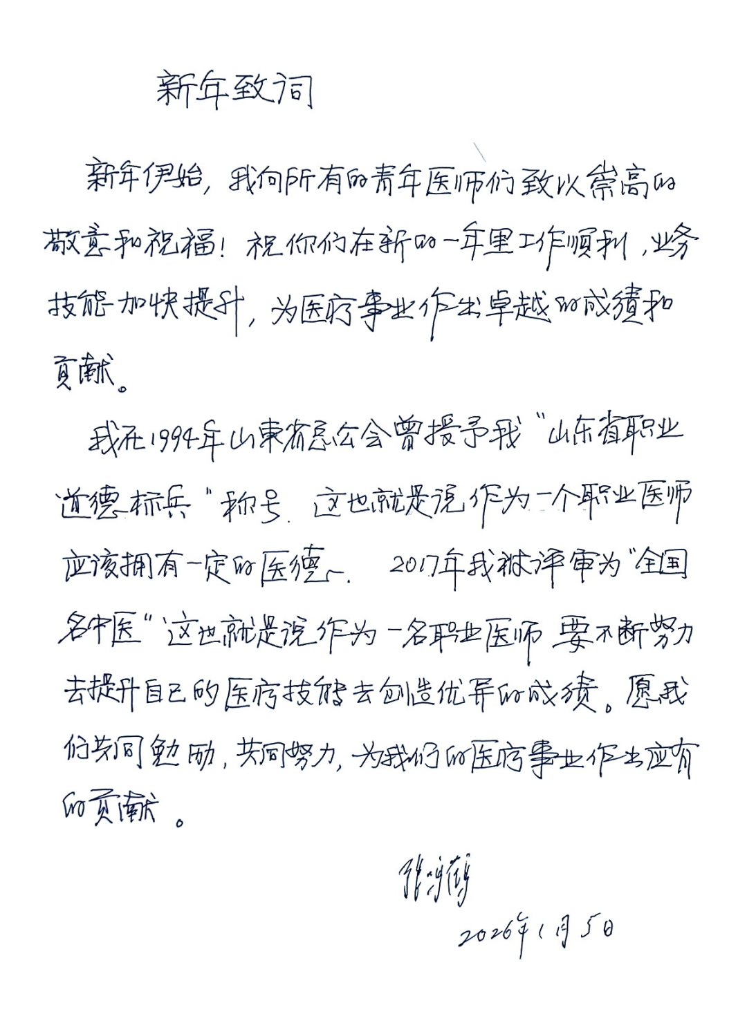 新春的脚步又一次临近,张鸣鹤教授亲笔写下的新春寄语,静静地放在我的案头。纸上的字迹,一如老先生行医七十年的那双手——苍劲里透着温润,沉稳中藏着深情。墨迹间流淌的,是岁月的重量,更是医者始终如初的温度。