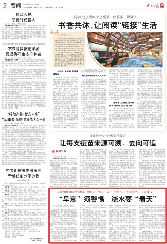 4月23日,2版要闻刊发《“早衰”须警惕 浇水要“看天”》,报道肥城市举办小麦中后期管理暨防灾减灾现场培训会,农业专家到田间地头现场为小麦“体检”。
