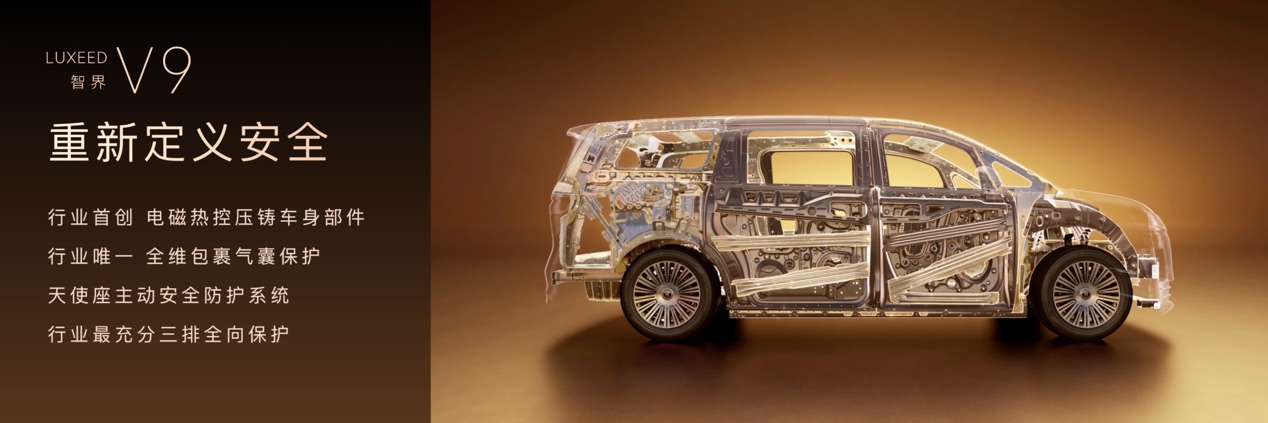 安全是最大的豪华。行业首创的颠覆性电磁热控压铸车身部件[13],车身强度大幅提升,解决传统MPV第三排最薄弱的安全隐患,真正实现座座安全平权。行业唯一全维包裹安全气囊[14],全方位守护头颈胸等关键部位,带来“金钟罩”般的安全保护,七重联动防护构筑从头至臀的立体防护网。天使座主动安全防护系统,可在碰撞前二三排靠背主动回位,提前预判风险,防患于未然。并配合潜艇级热成型钢三排核心骨架、三排超长侧气帘和侧气囊,打造行业最充分三排全向保护。智界V9凭借硬核车身、颠覆性压铸技术、13个安全气囊等技术,重塑高端旗舰MPV安全价值标杆。
