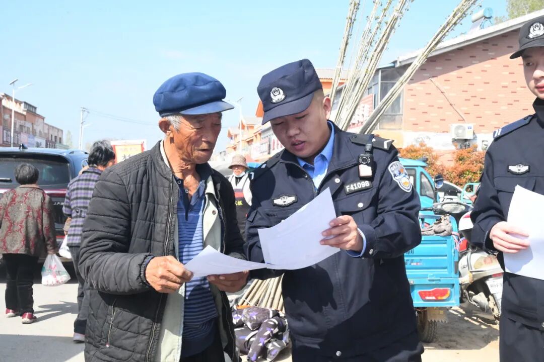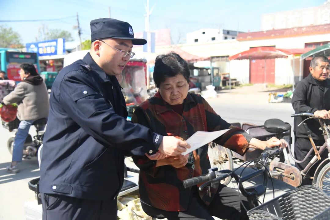 在熙熙攘攘的集市,民警操控无人机沿集镇主干道、农贸市场周边道路等人员车流密集区域精准飞行,针对老年人易受骗特点,循环播报“低价购物陷阱”“扫码领礼套取信息”“冒充公检法”等高频骗局预警。遇到驻足围观的群众,无人机还会临时悬停强化播报,配合地面民警发放宣传手册的同步讲解,形成“天上喊、地上讲”的联动效应。“这种宣传方式太新颖了!抬头就能看到无人机,声音听得清清楚楚,比贴海报、发传单印象深多了。”正在路边买菜的张阿姨说道。