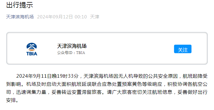 2024年9月11日晚,天津滨海机场因无人机导致的公共安全原因,航班起降受到影响。截至当晚23时,航班延误29架次,取消8架次,有32架次备降外场,3000余名旅客出行受到影响。