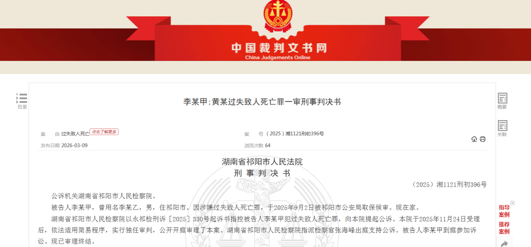 法院审理后认为,被告人李某甲因过失致1人死亡,其行为已构成过失致人死亡罪。综合考虑其具有自首、认罪认罚、积极赔偿并获得被害人家属谅解等情节,以及社区矫正机构适用社区矫正的评估意见,法院依法作出一审判决:被告人李某甲犯过失致人死亡罪,判处有期徒刑一年六个月,缓刑二年。