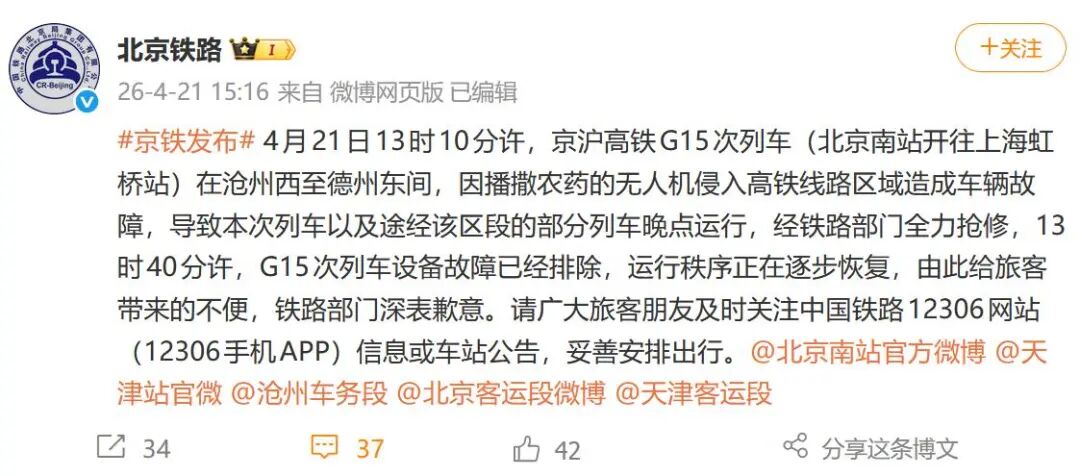 2026年4月21日13时10分许,京沪高铁G15次列车(北京南站开往上海虹桥站)在沧州西至德州东间,因播撒农药的无人机侵入高铁线路区域造成车辆故障,导致G15次列车以及途经该区段的部分列车晚点运行。