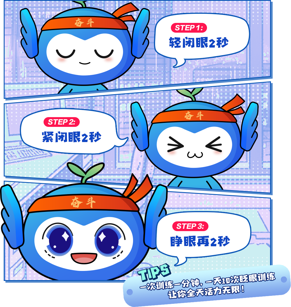 建议多做眨眼操:轻闭眼2秒→紧闭眼2秒→睁眼再2秒。每次训练1分钟,每天至少做10组眨眼训练!