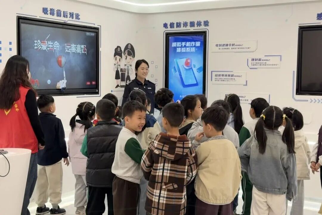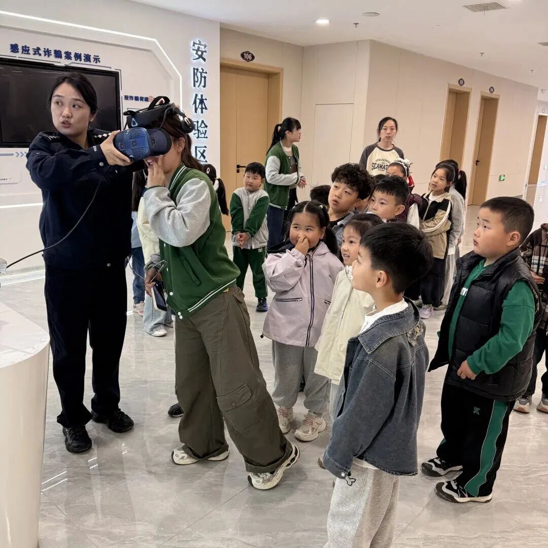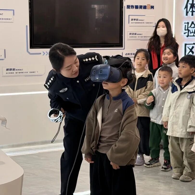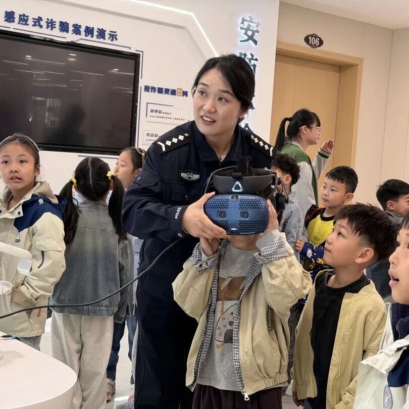 “护航青春,共‘童’成长”,安全守护不止于反诈。在完成反诈知识宣讲后,民警同步开展禁毒安全宣传教育,化身专属“安全讲师”,用通俗易懂、贴近孩子的语言,从毒品的定义、毒品的严重危害、常见毒品伪装形态等方面,由浅入深、层层递进开展讲解,结合真实涉毒案例与直观图片资料,把枯燥的禁毒知识转化为易懂易记的安全常识。为让毒品危害更加可感可知,活动现场设置VR禁毒体验、吸毒容貌模拟互动环节,少年儿童轮流佩戴VR设备,亲身感受吸毒后产生的眩晕、视线模糊、身体失控等恶劣反应,通过容貌模拟设备直观见证吸毒对人体容貌的毁灭性摧残。现场少年儿童纷纷发出惊叹:“原来吸毒危害这么大,太可怕了!”通过科技化、沉浸式的体验方式,让“远离毒品、珍爱生命”的理念深深根植于每一位孩子心中,从源头筑牢少年儿童禁毒思想防线。