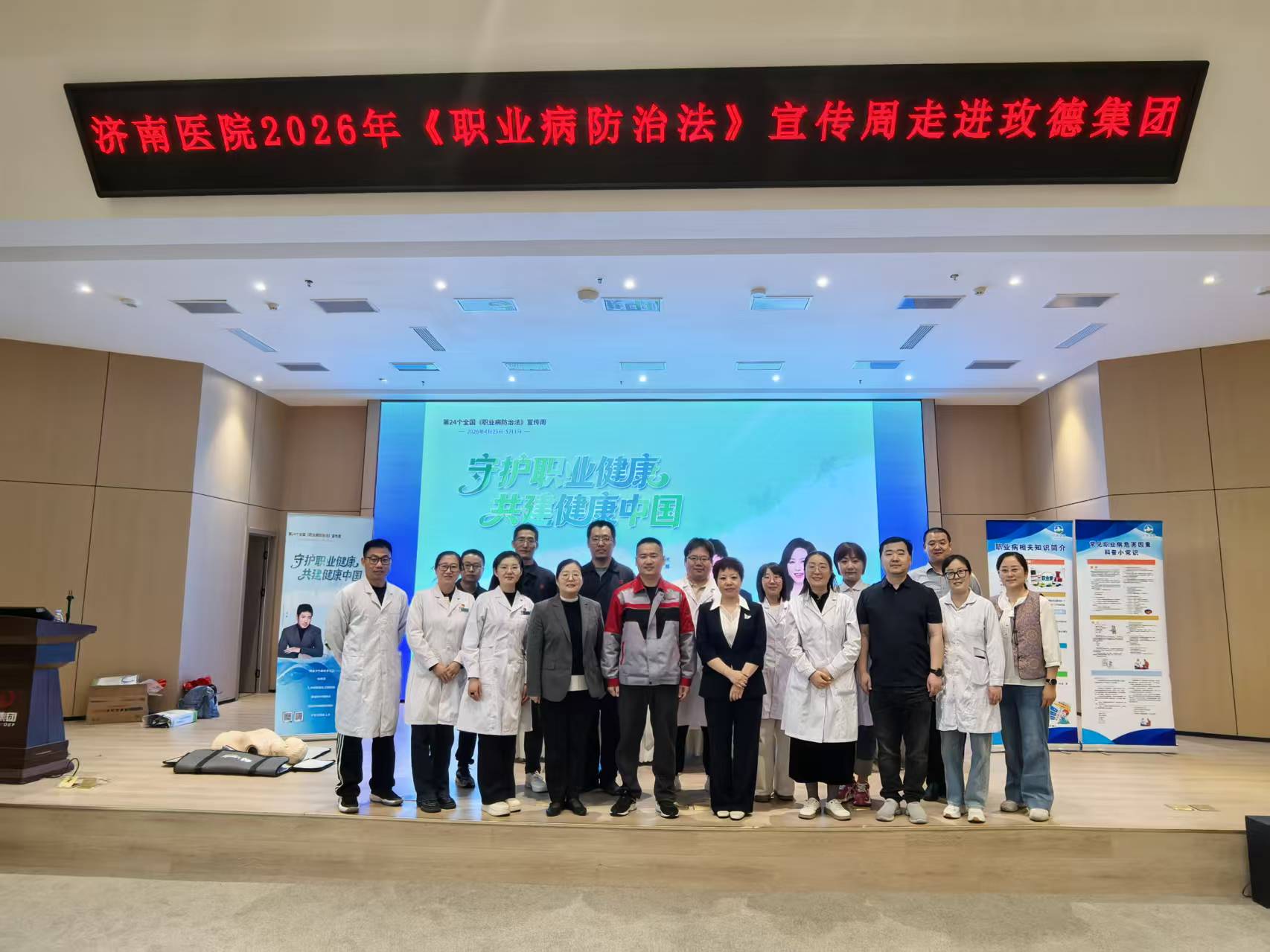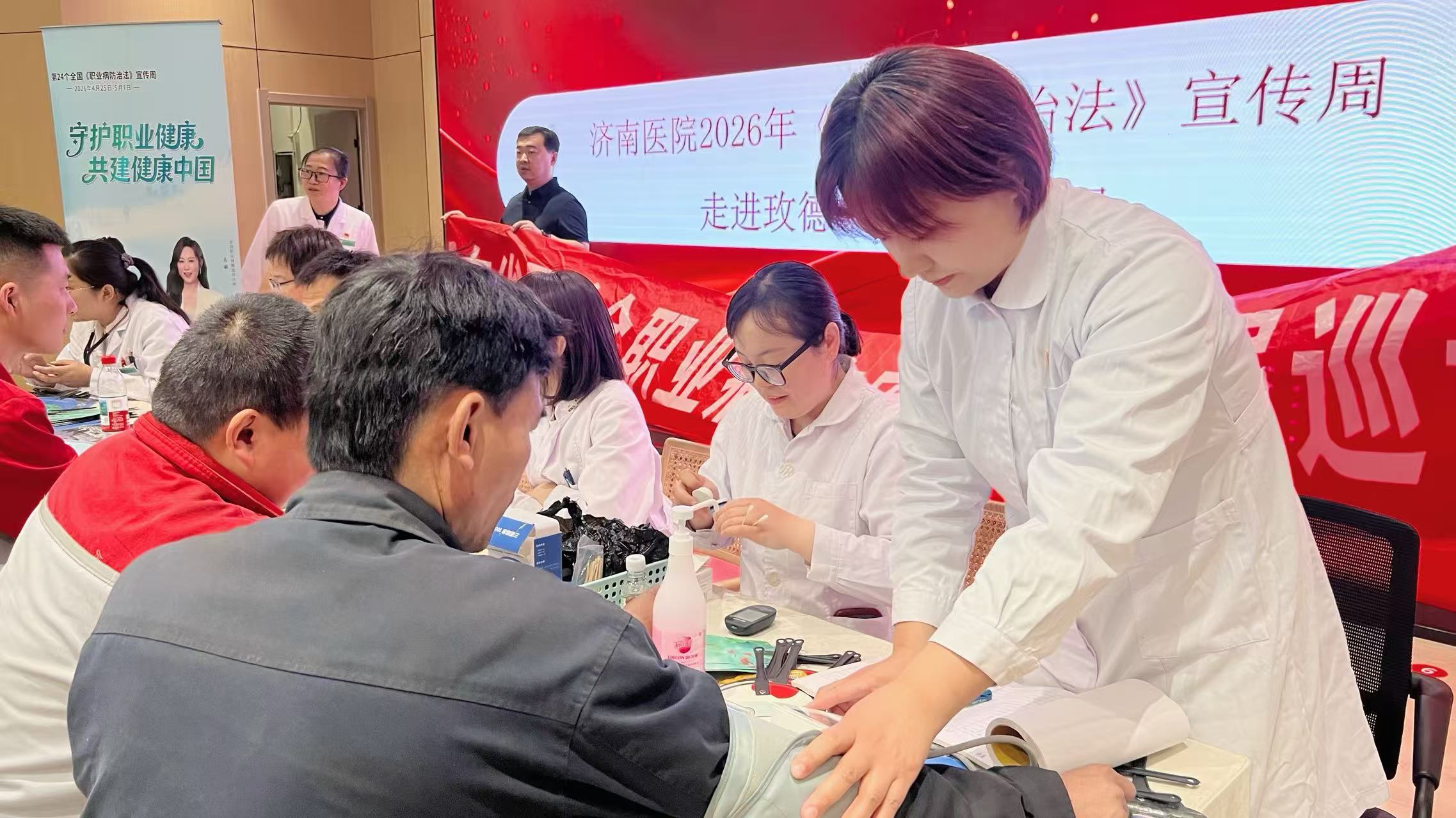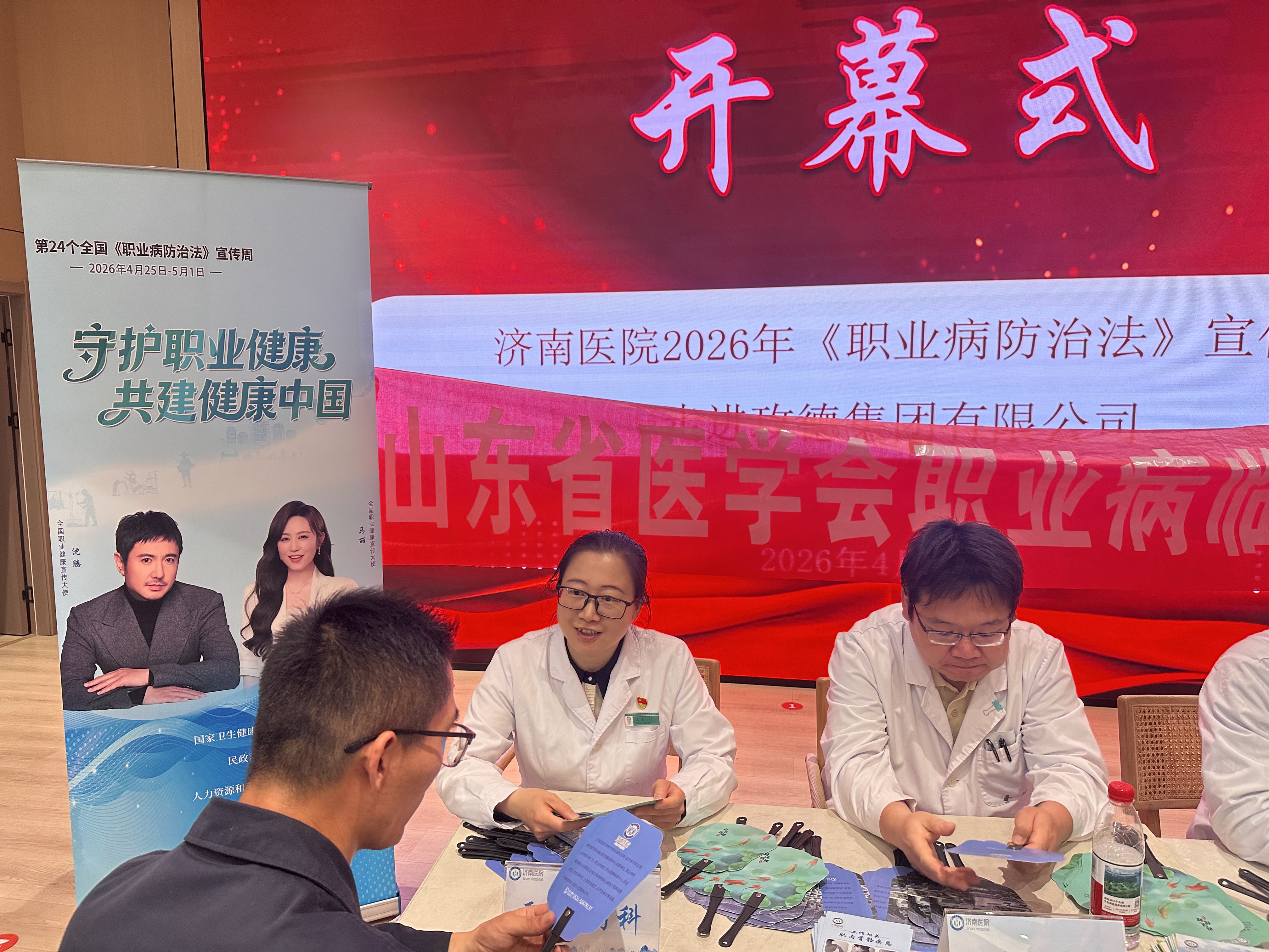 2026年4月24日-5月1日是全国第24个“职业病防治法宣传周”,今年的主题是“守护职业健康 共建健康中国”。4月24日,济南医院院长、党委副书记谷晓新带队走进平阴玫德集团有限公司,开展“职业健康知识宣教+多学科义诊”形式的职业健康宣传活动,为一线劳动者普及职业病防治知识,提升劳动者职业健康素养贡献力量。