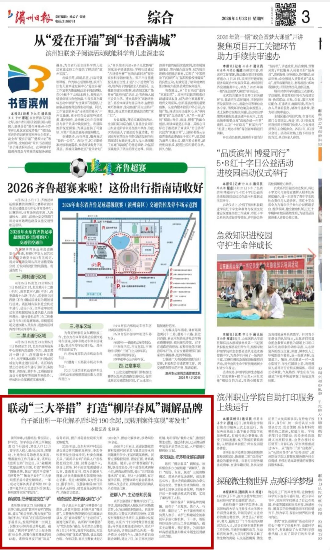 4月23日,滨州日报以《联动“三大举措” 打造“柳岸春风”调解品牌》为题,详细报道邹平市公安局台子派出所深耕、做实主防警务,联动“三大举措”,为黄河岸畔高质量发展和群众幸福生活贡献公安力量。