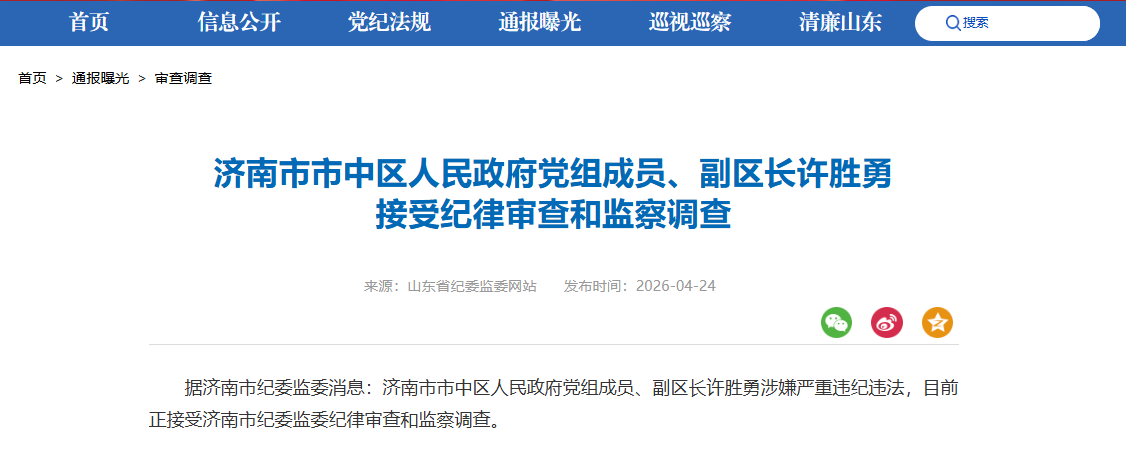 济南市市中区人民政府党组成员、副区长许胜勇被查打虎拍蝇猎狐 | 2026-04-24 17:57:59 微信扫码扫码下载客户端4月24日,据济南市纪委监委消息:济南市市中区人民政府党组成员、副区长许胜勇涉嫌严重违纪违法,目前正接受济南市纪委监委纪律审查和监察调查。责任编辑:李思羽