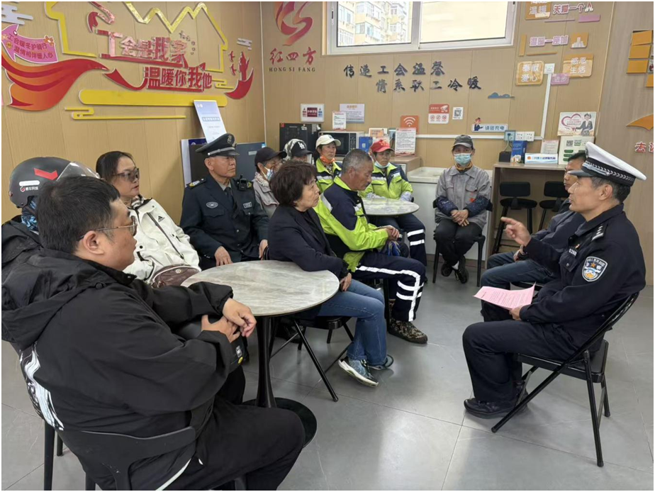 活动现场,街道唐书记首先向坚守岗位的劳动者们致以节日问候,感谢他们为城市整洁、社区安宁、居民便利所付出的辛勤汗水。随后,交警结合劳动者的工作特点,开展了一场接地气的交通安全宣讲。针对外卖员赶单时易出现的闯红灯、逆行、不规范佩戴头盔等行为,警官通过近期发生的典型事故案例,剖析交通违法的危害,讲解正确的骑行规范;针对清洁工、保洁员在道路作业时的安全风险,重点强调穿戴反光装备、避让车辆的重要性;同时提醒小区保安在指挥车辆时注意自身防护,遵守交通信号。