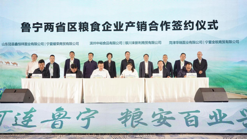 在鲁宁双方领导及嘉宾的共同见证下,两省区粮食和物资储备部门签署了粮食产业发展战略合作协议。随后,山东冠县鑫恒祥面业与宁夏耀荣商贸、滨州中裕与银川来新利商贸、菏泽华瑞与宁夏金欧商贸等多对企业现场签署产销合作协议,标志着鲁宁粮食产业市场化合作迈出实质性步伐。