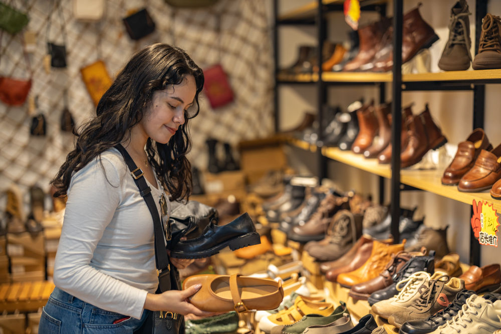 ↑ 4月22日,在重庆市渝中区新重庆国际小商品批发中心,来自墨西哥的游客在选购女鞋。