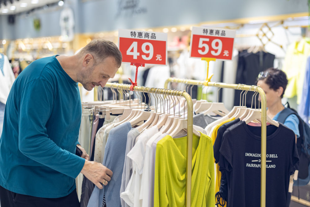 ↑ 4月22日,在重庆市渝中区新重庆国际小商品批发中心,来自德国的一对夫妇在选购衣服。