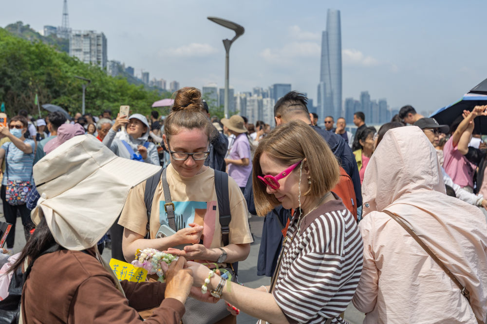 ↑ 4月23日,在重庆市渝中区李子坝观景平台,外籍游客购买茉莉花手串。