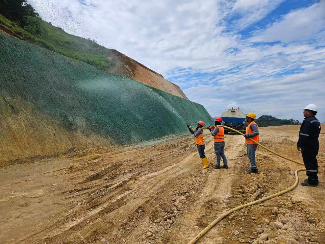 项目针对边坡高陡、岩土混合、保水困难等关键难点,创新采用“纯草种喷播+长效肥+附着物”本土化快速复绿工艺,选用适宜当地生长的乡土草种,配合洒水车精细化人工喷播,在最短时间内形成连续植被覆盖,有效遏制坡面冲刷与水土流失。施工全过程实施严格环保管控,严控施工扬尘与机械噪音,规范土石方堆放与处置,强化地表径流与地下水保护,杜绝污水直排、固废乱堆、危废乱放,最大限度降低对土壤、水体、空气的影响。建设者还主动救助受伤树懒等野生动物,以温情守护生物多样性,让雨林生灵安心栖息。